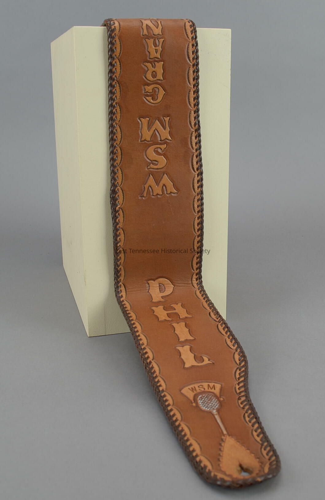 Guitar strap of Phil Campbell, tooled leather, shows silver-painted WSM microphone at one end, marked "PHIL / WSM / GRAND / OLE / OPRY" in vertical lettering through center length, short buckled strap at opposite end marked "BY JOHNNY / & / ANN / LETNER," unused, 46"l x 3 1/4"w, date unknown.Made/Created