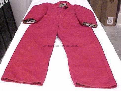 Hunting jumpsuit, red with gray wrist cuffs, red corduroy collar, front zipper with snaps, zippered left and right breast pockets set at a slant, narrow proper left sleeve pocket, two back pockets (left one zippered), elastic at left and right side waistband, interior labels read "Lot 9221 Medium Chest 38-40," and "Zero-Zone Insulated Outerwear" (with illustration of thermometer).Dimensions