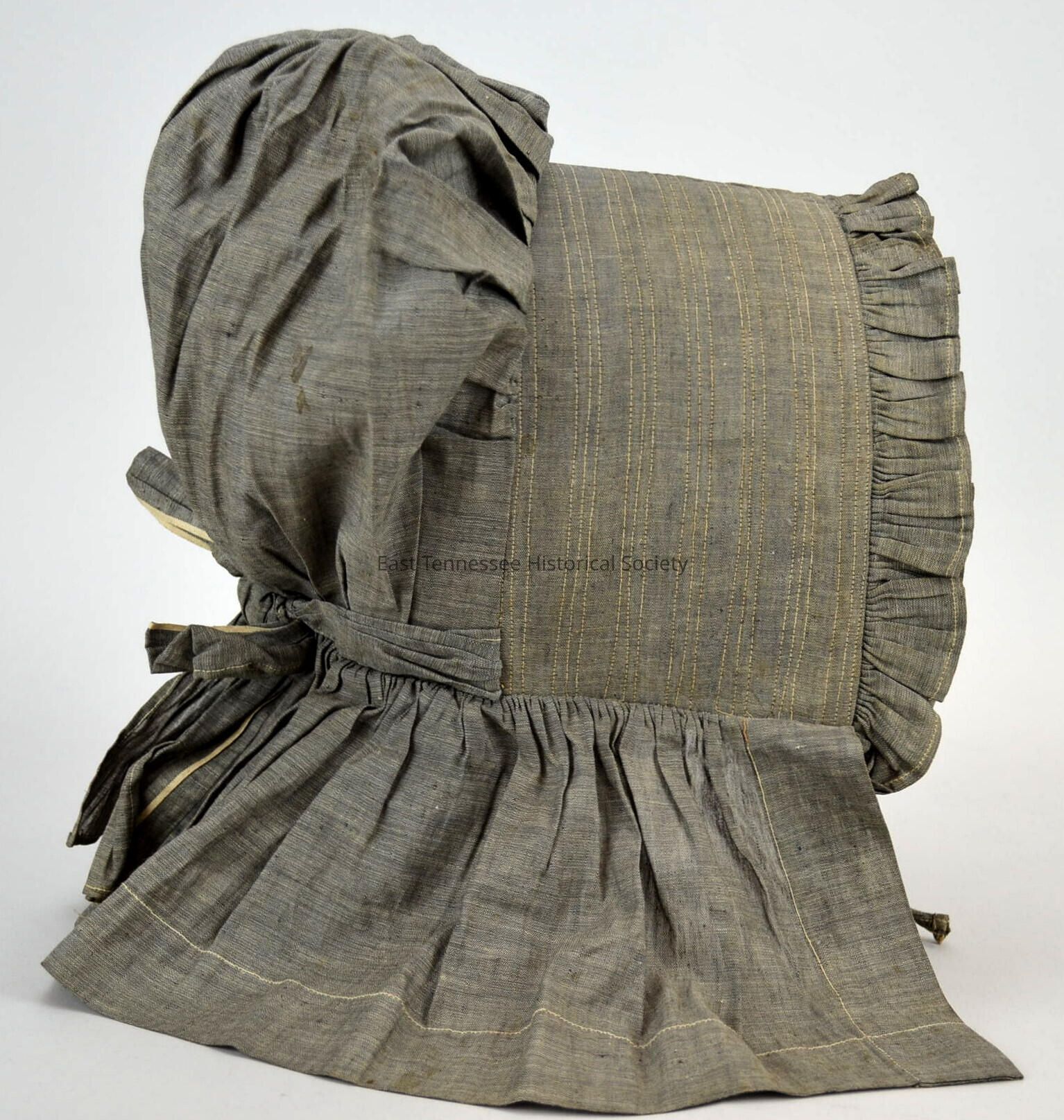 Woman's sunbonnet of Mary Jane Tolbert Solomon, light-brown cotton with yellow threads woven in, poufed back with drawstring inside and wide tie and bow on exterior, brim stiffened with paper sewn between layers of fabric with rows of triple stitches 1/2" apart, 7" long skirt attached to protect wearer's neck, double ruffle trim along front, 17"l x 1"w ties on each side, inside tie under chin, large/16"h x 11"w x 13"d, late 1800s-early 1900s/1890-1909?Made/Created