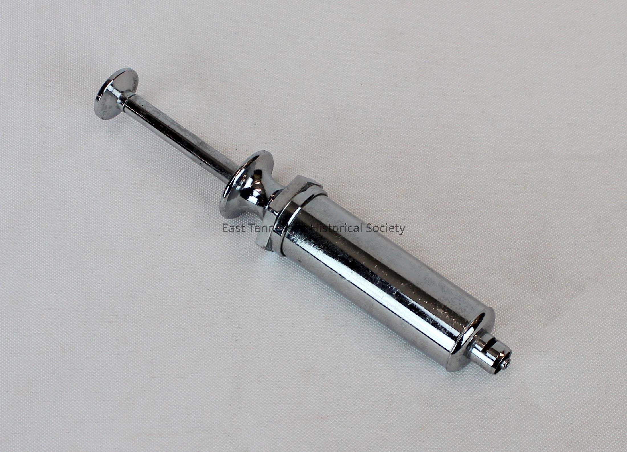Stainless-steel syringe, BMS on top of plunger, 6 1/4"l x 1 1/4"w.