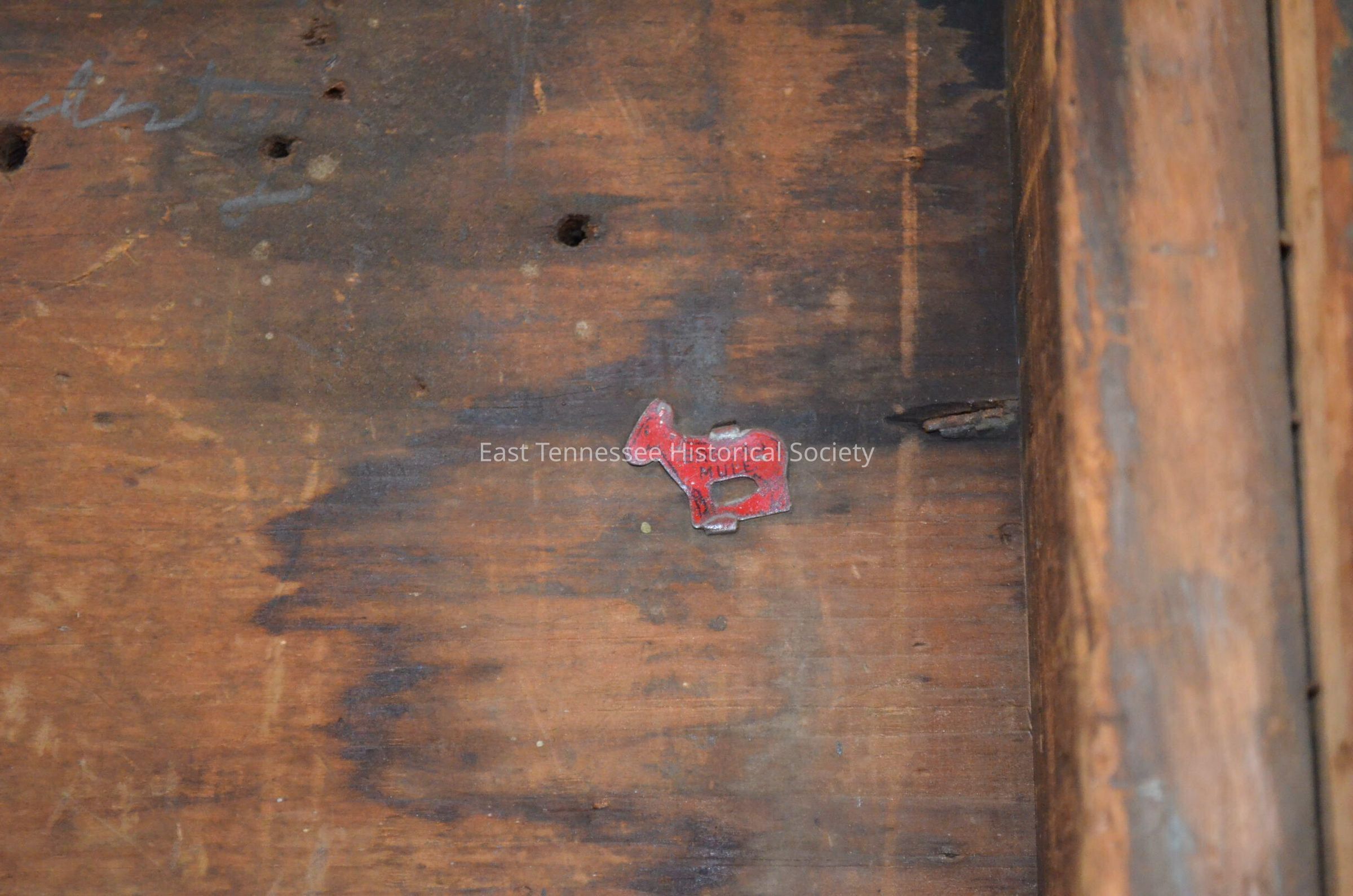 Brown's Mule tobacco tag, lithographed tin in shape of mule, marked "BROWN'S / MULE," c.1890s. [Tag was the only thing to identify tobacco. Would be inserted into plug; user would typically take off and discard.]