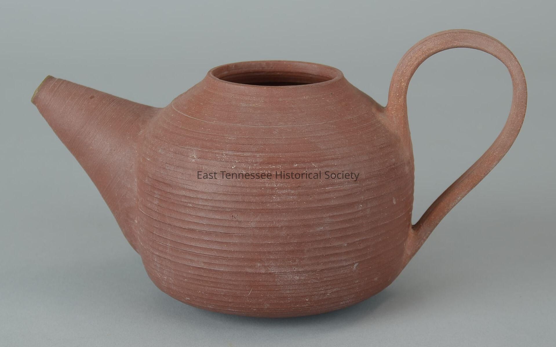 Teapot (w/o lid) made by Sara B. Young, muted-red clay from Eagle Bend Farm (Sara's family's farm in Clinton), round body with spout wide at bottom and small at top, large looped handle, ribbed around sides in simple line design, fired w/o glaze, base inscribed "Sara Young / Eagle Bend Pottery / Clinton, Tenn.," 4 5/8"h x 8 5/8"w, date unknown (1951-?).Dimensions