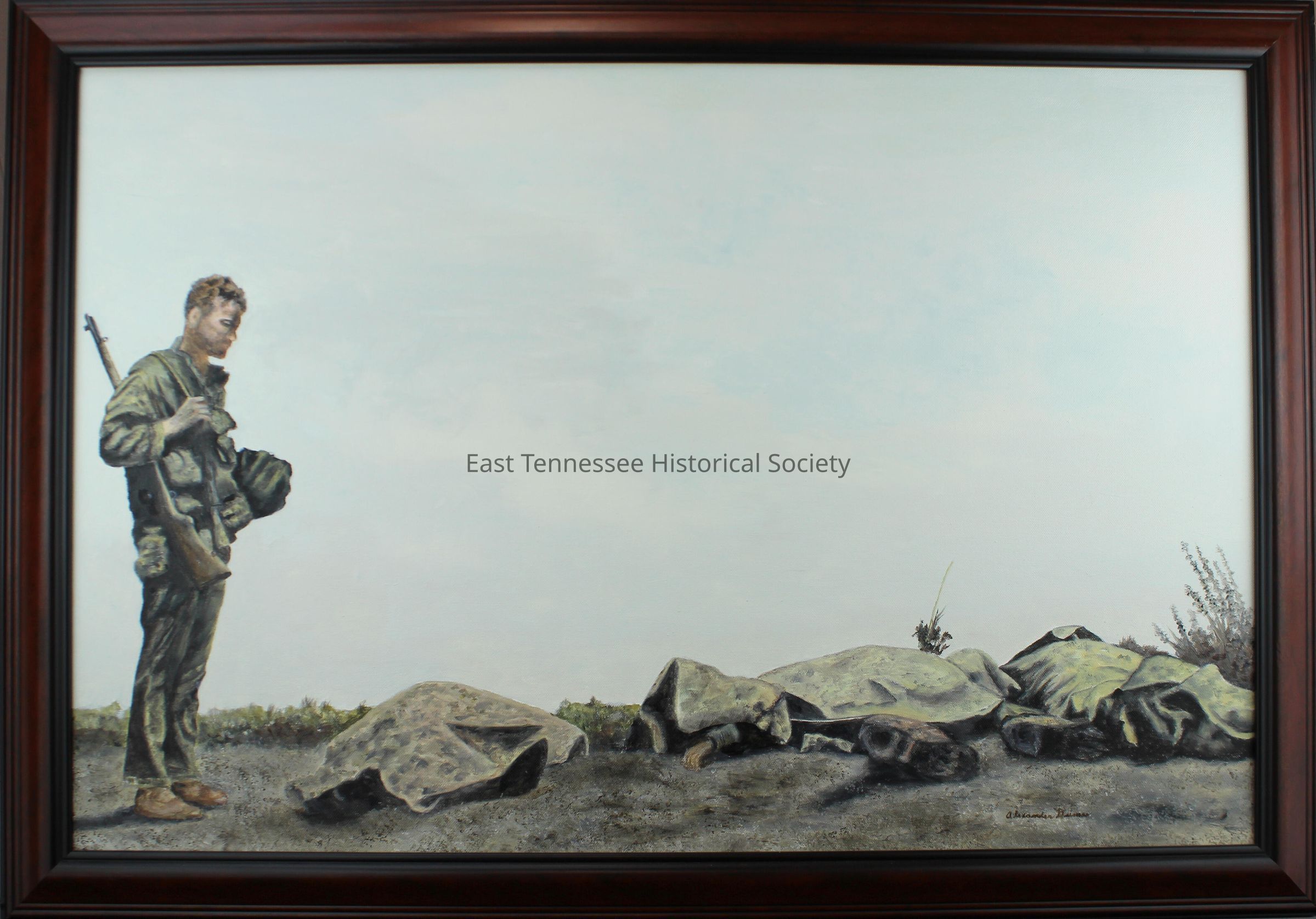 a) Painting entitled "The Last Goodbye" by Alexander Dumas, oil on canvas board, depicts long soldier standing over body bags of fallen comrades after Battle of Okinawa, signed "Alexander Dumas" bottom right corner, 23"h x 35"w image size, date?