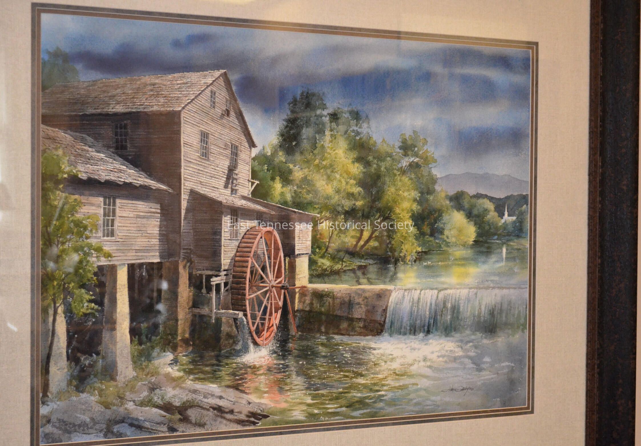 a) Painting entitled "The Old Mill"* by Jim Gray, watercolor, shows mill rush on left side/dam on right with falls/white church in distant right, signed "Jim Gray" at lower right