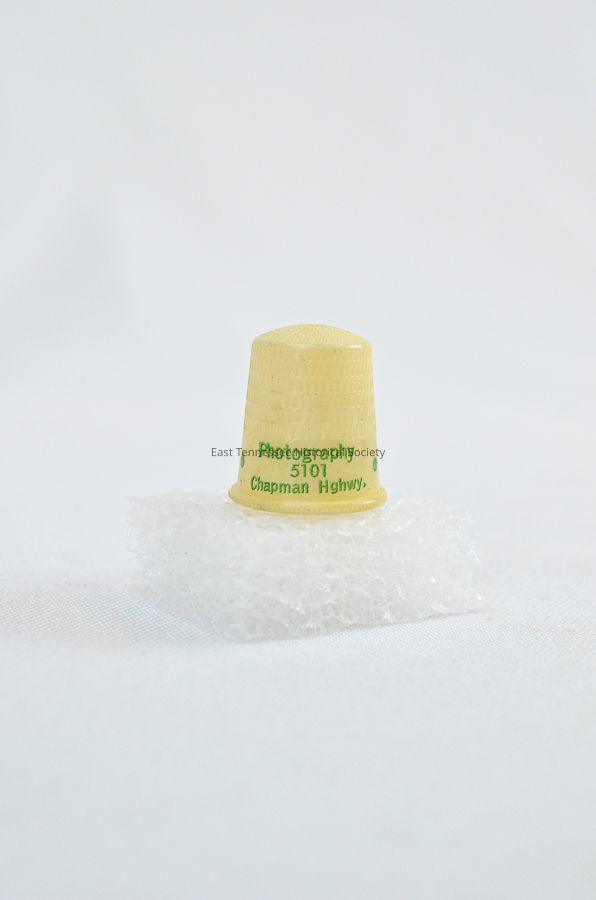 Advertising sewing thimble, yellow with green lettering saying, "Sew you'll remember Bruce G. Leslie Studio// Photography 5101 Chapman Highway"Made/Created