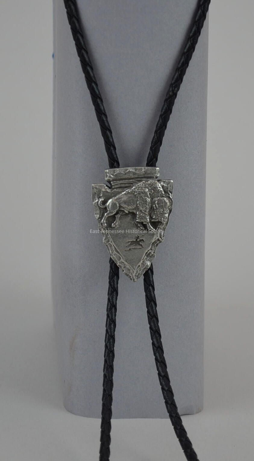 Bolo tie of George Riddle, black cord with silver tips to fasten around neck, ornamental clasp in shape of arrowhead (point downward) decorated with buffalo in relief above Indian with spear riding atop galloping horse, back marked "[copyright symbol] 1988/ Siskiyou/ Buckle Co. Inc./ WILLIAMS, OREGON/ 880546."Made/Created