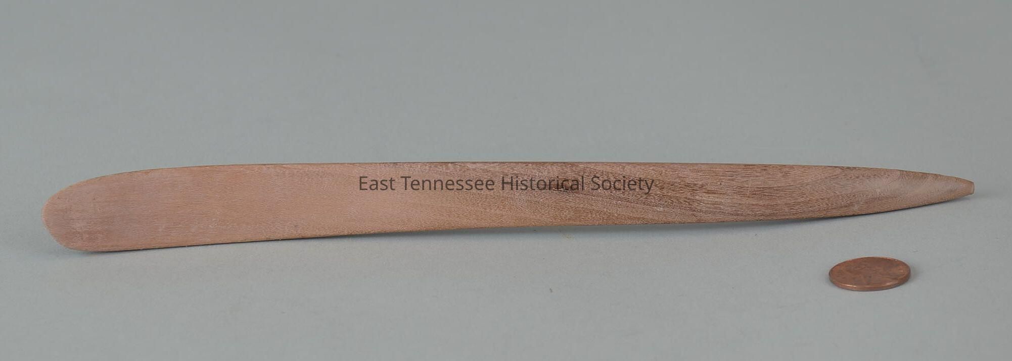 Forming tool used by Sara Young, curved (much like a spoon) nutmeg-colored wood, one side rounded and other side flat across entire length, dull point, manufacturer unknown, 9 1/8"h x 1/2"d x 7/8"d, date unknown (1951-?).