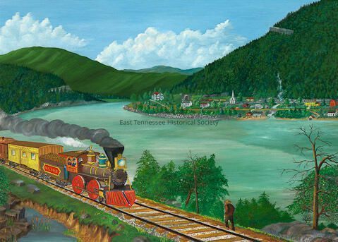 "Train-A-Coming" or "When Railroads First Came to East Tennessee" by W. R. Briscoe, oil on board, signed "W. Russell Briscoe" and dated bottom right, 22" x 30" with 2" wood frame, 1958.Collection