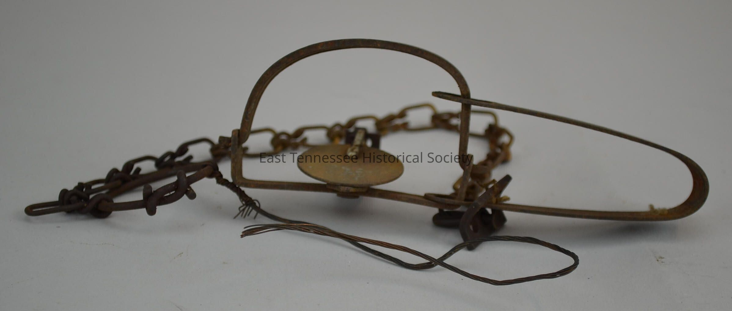 Small-animal trap used by Fred Mayford Pickens Sr. to catch muskrats, metal construction, spring activated, manufacturer unknown (possibly Oneida Victor, Cleveland, OH), 2 1/8"h x 33 1/2"w, late 1940s-early 1950s (per donor).Made/Created