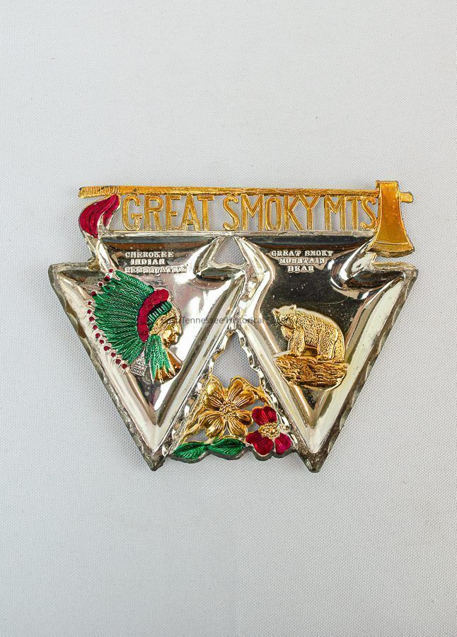 Tray, "Cherokee Indian Reservation", "Great Smoky Mountain Bear". Metal decorative tourist tray, with gold axe and "Great Smokey Mtns" in the shape of two arrowheads, containing colored images of a Native American wearing a head dress, and a bear on top of a rock. Two decorative flowers on the bottom.Made/Created