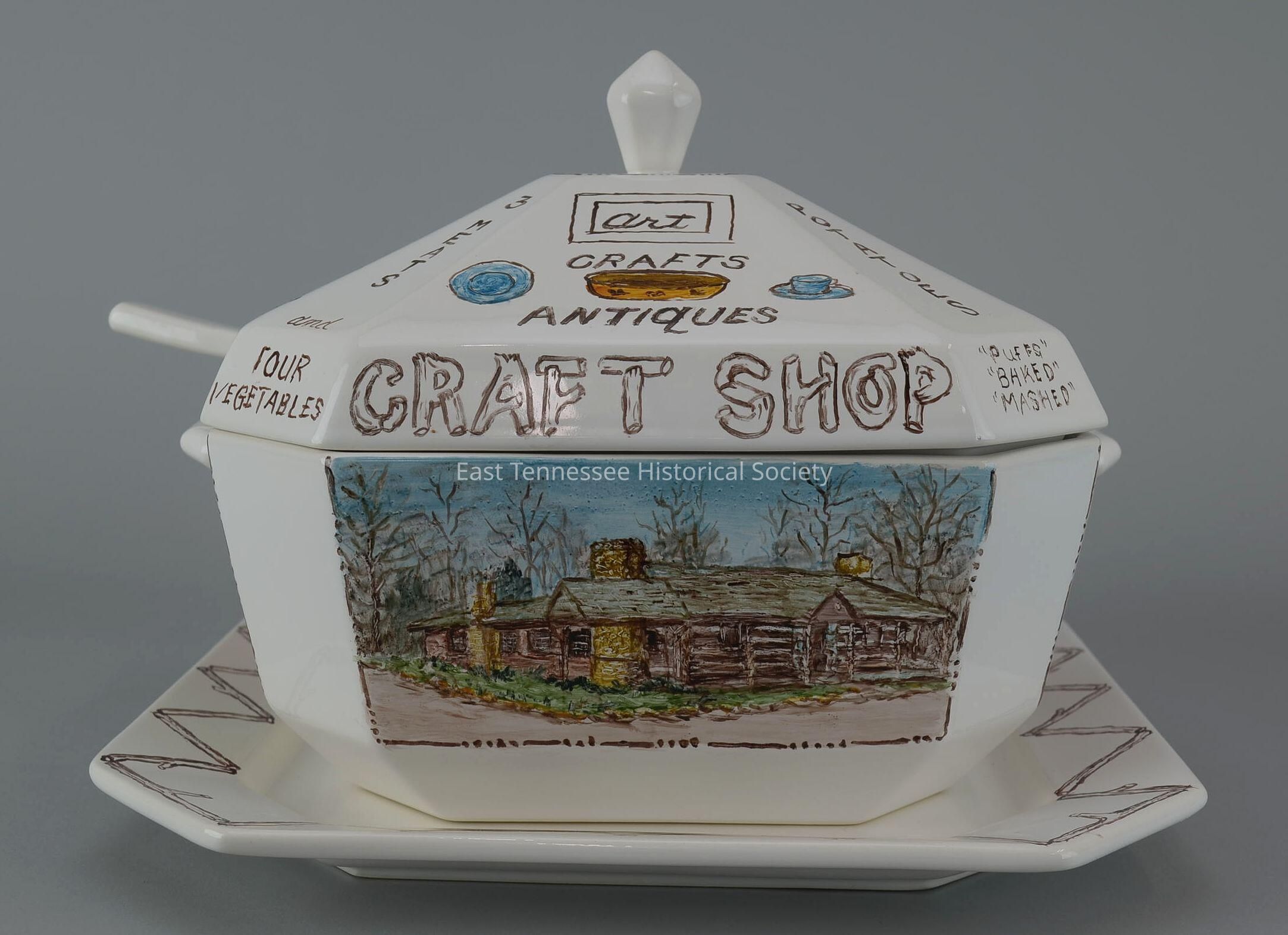 a) Tureen (not original to the Pioneer House), white shiney-glazed ceramic, artwork--including depictions of the restaurant, log cabin crafts shop, farm wagon for rides, red-brick home next door of owner and proprietor Maggie Rose Love (and her mother, Mrs. Ben F. Rose)--painted/fired by Rose Ridings (artist's signature below shop painting at bottom right corner), shelf handles on two opposite sides, 4 1/2"h x 12"w x 12"d (body)/5"h x 10"w x 10"d, unknown manufacturer, painted c. 2012. b) Lid, white ceramic, hexagonal with square-off corners, white pointed hexagonal knob handle at top center, hand-painted "Pioneer House" on one side, "Craft Shop" on opposite side, menu items and illustrations cover elsewhere.