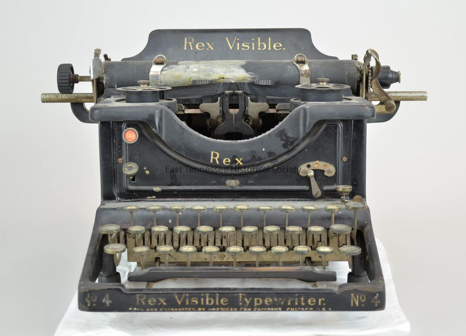 Rex Visible typewriter with operating manual from Frank L. Gass & Co. dry goods and general store, 11 1/2"h x 17 1/2"w x 14 1/2"d, c. 1915.