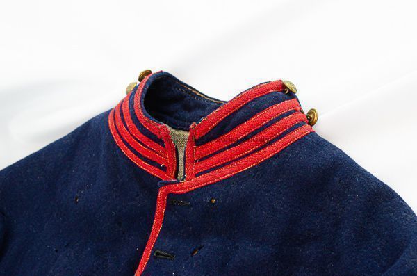 Union Army jacket; Civil War; dark blue wool trimmed in red wool; 11 brass spread eagle buttons down front; 3 red bands with 2 buttons either side stand-up collar; 1 red band around neck edge, down front edge, around back edge, etc.; 1 red chevron 2/3rd down sleeves; 2 belt supports rear; tan twill lining. John Watkins Collection. Light artillery round jacket worn by donor's great uncle, Corporal John Watkins, 19th Battery of the Ohio Light Artillery, stationed at Fort Sanders, Knoxville, under the command of Gen. Ambrose Burnside, during the assault of Fort, Nov. 29, 1863.Dimensions