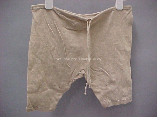 b) Drawers/underpants worn with baseball uniform of Columbus Cook Horton, natural-color wool, drawstring at waist, 5"l legs, unknown manufacturer, 17"h x 17"w, 1907-1912.Made/Created
