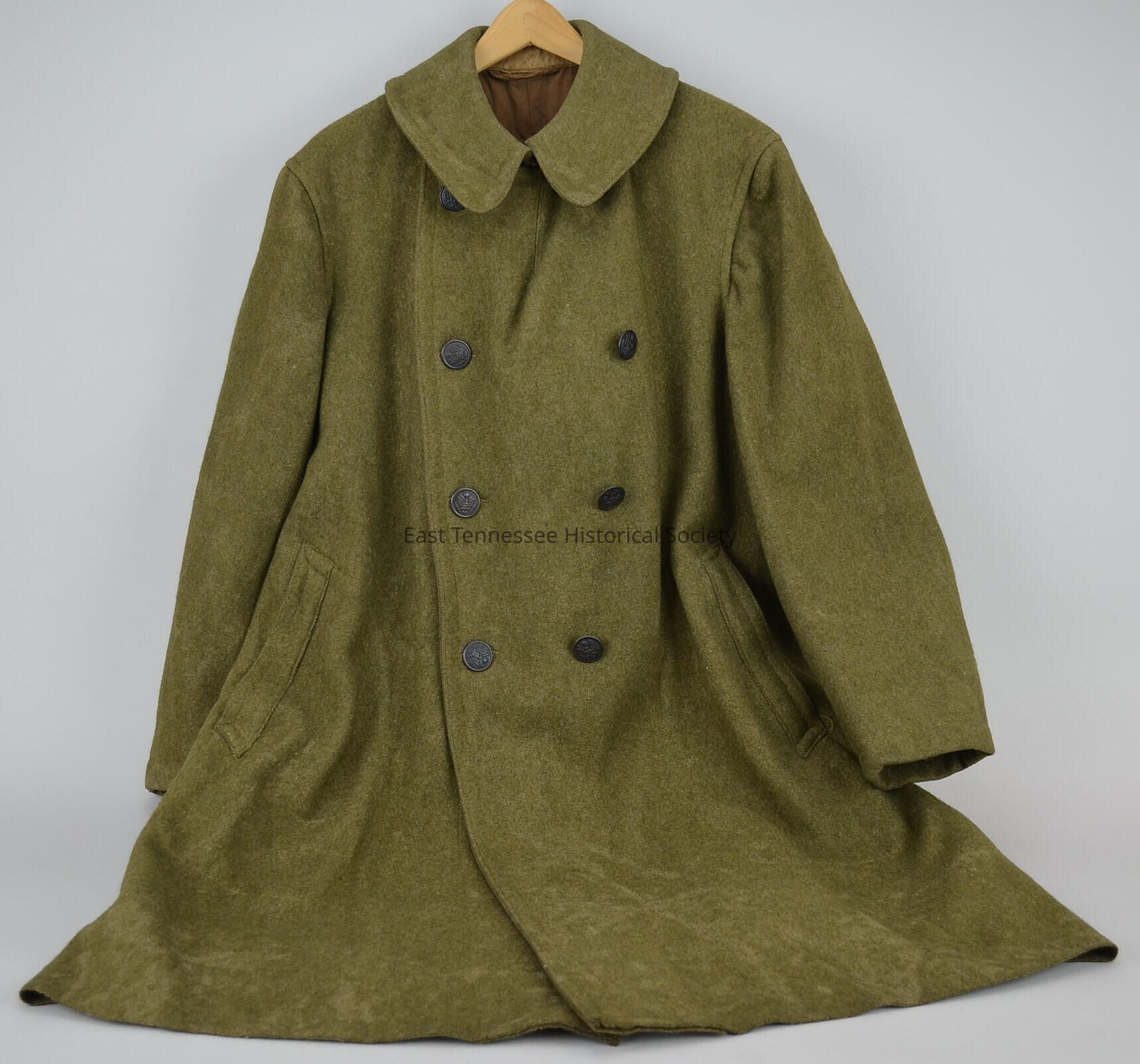 Military overcoat of Victor Hill Klein, Model 1918, olive drab felted wool, double breasted, turned-up collar with smaller button under right side, tab with buttonhole under left side, metal hook and bar sewn into collar band, large placket pockets at front skirt, eight large dark metal buttons with U.S. seal, skirt pockets with button/accessible from interior, belt on reverse with two working buttons and holes, back slit, breast pocket on interior left, name "KLEIN" marked in red on lining back and breast pocket, unknown manufacturer, 46"h x 20"w, 1918.Made/Created