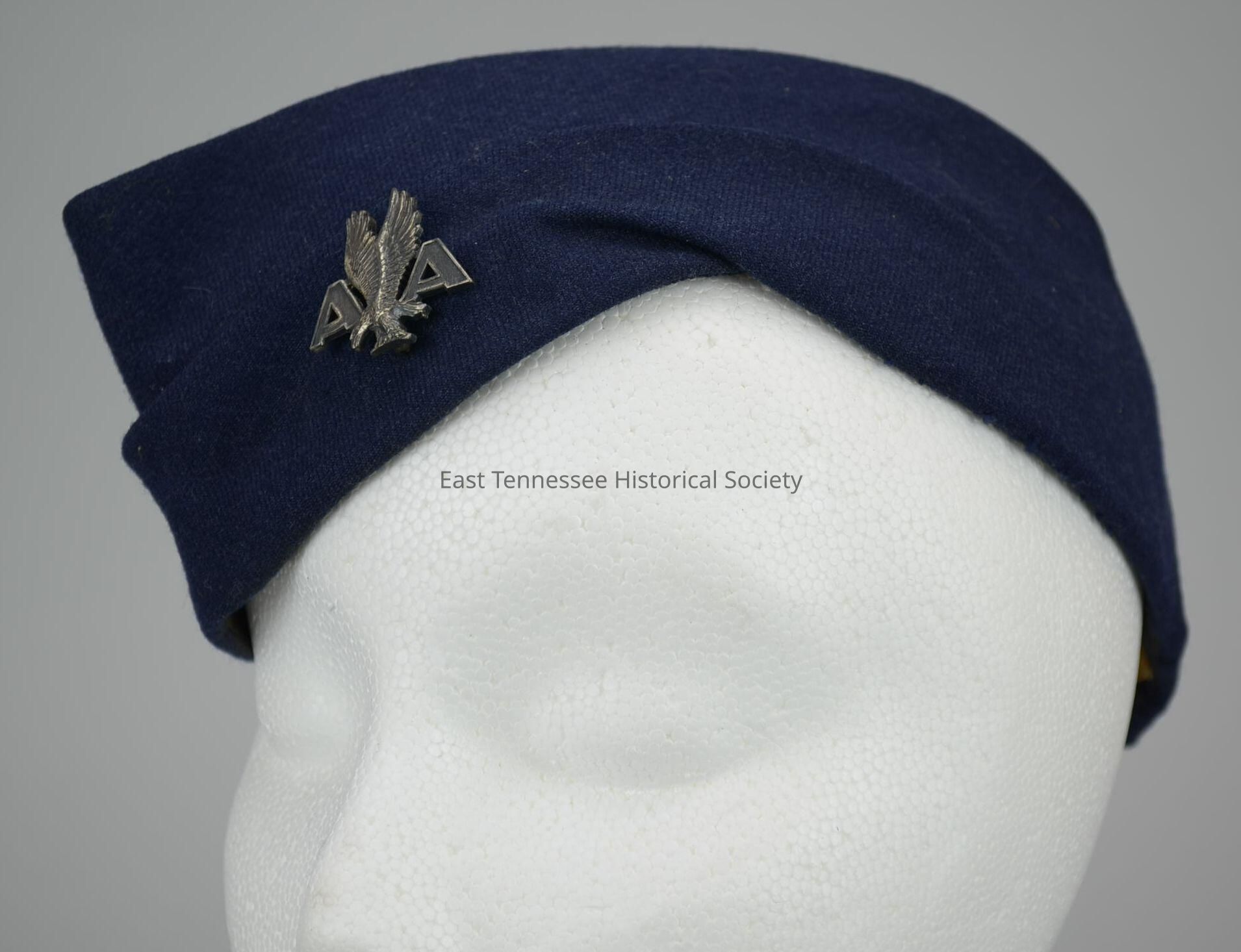 American Airlines stewardess uniform cap (winter) of Esther Carlson, navy-blue wool, center section tucked and sewn into 12 ridges ending in point at back, plain sides with pleats and turned up cuff, cuff on left side goes almost to back, cuff on right side ends 3 1/2" from center, fully lined in stiff black cotton with navy grosgrain ribbon facing, underlined in coarse stiff fabric, label marked "De Jean / CHICAGO," manufactured by De Jean (Chicago), 4"h x 9"w x 10 1/2d, probably 1939.
