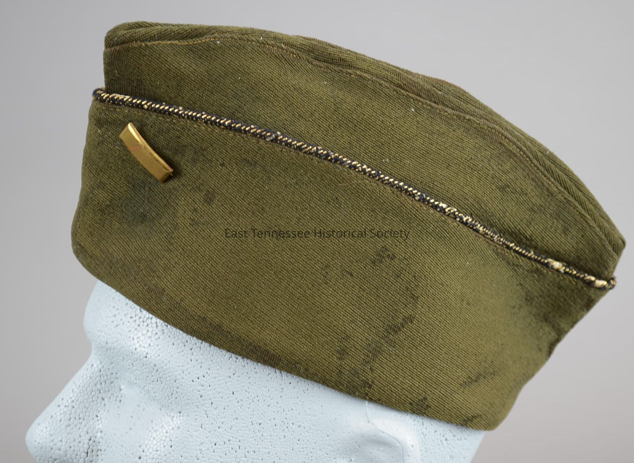a) Overseas cap of Robert LaForge, olive drab wool and cotton, commissioned officer's gold-and-black piping, leather sweatband on interior marked "R. M. LAForge" on left side and "1.01 / PRE? Materials "ELASTIQUE / 65% WOOL / 35 % COTTON / DISTRIBUTED BY / C? & CO (NY)" size 7 1/4, 5"h x 10 3/4"w, c. 1917.