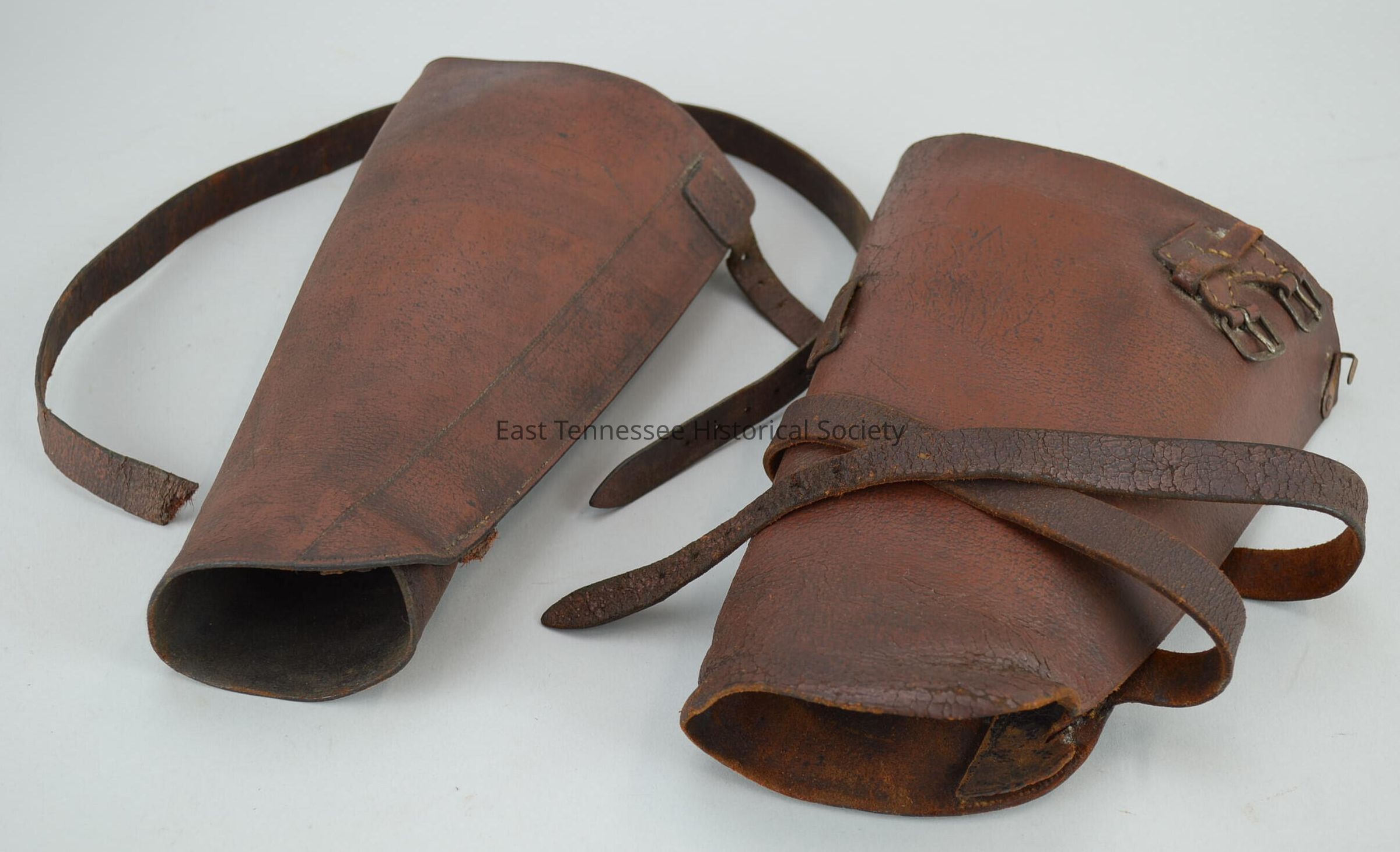 Pair of leg guards of Robert LaForge, dark-brown leather/metal buckle, marked "Franklin Simon & Co. / FIFTH AVENUE," 11"h x 18"w (in the round) x 1/8"d / 18"l strap, 1917-1918. Worn with standard pants, c. 1917. a) Left b) RightMade/Created