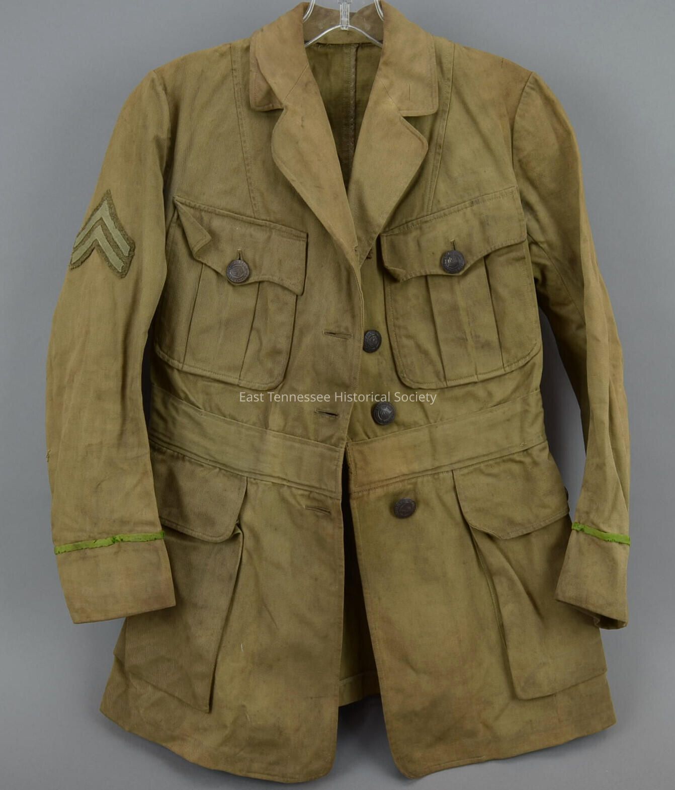 a) National League of Woman's Services (NLWS) Motor Corps uniform coat of Lucy LaForge, light olive heavy twill and metal, single breasted, two upper and lower pockets with button flaps, set in waistband with flared skirt, metal buttons with shield and "National League for Woman's Service" around edges, green stripe around each sleeve denotes rank, corporal stripes on right arm, wire hooks at waist, unknown manufacturer, 29"h x 14"w, WWI/c. 1918.Made/Created