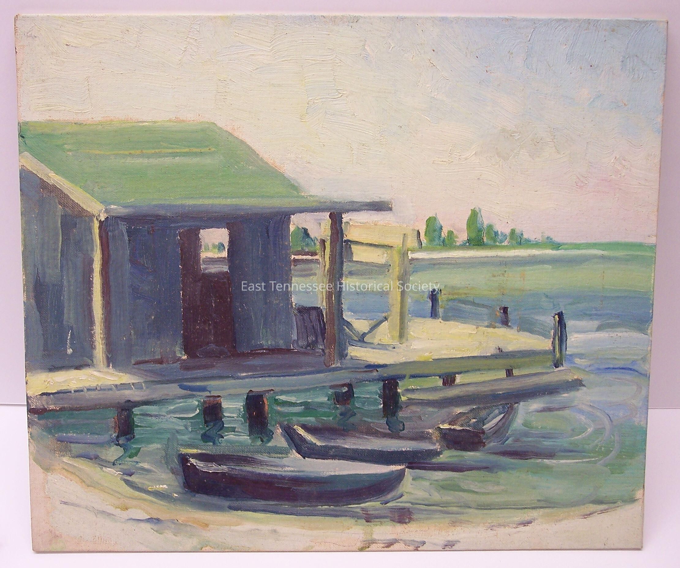 Painting (Jim Gray #41) by Louis E. Jones, oil on canvas board, shows three wooden row boats anchored in water in front of green-roofed gray-wood shed on dock that extends into water, open shed door and window line up so viewer can see shoreline at horizon behind, several trees in the distance, green/aqua/teal/cobalt swipes in water, pink sky at horizon extending to yellow-white and blue, white and golden sand, marked #41 at top left back corner, sticker at center marked "NEWTON / EXTRA QUALITY COTTON / CANVAS BOARDS / size 12 x 16" / 45 [in pencil] / WINSOR + NEWTON / INC.," 11 3/4"h x 14"w, 1900-1958. [former L2013.3.27]Collection