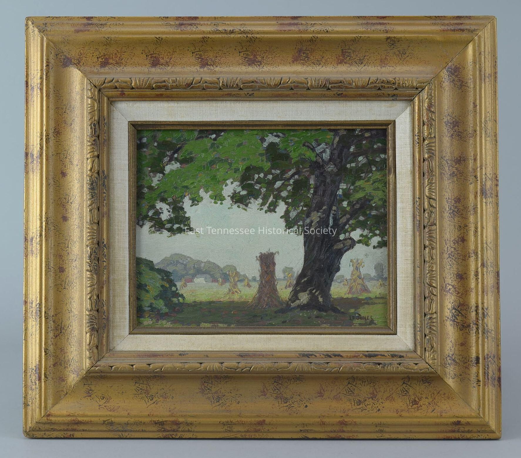 a) Painting (Jim Gray #22) by Louis E. Jones, oil on canvas board, shows field of cornstalk stacks with farm in distance and wooded area beyond, large tree in foreground with branches somewhat framing scene, muted blue sky with yellow/green undertones, very green field, signed "LE JONES" in bottom right corner, 7 1/2"h x 9 1/2"w sight/image size, c. 1915*. [former L2012.3.14a-b] * based on similar subject matter of dated painting.