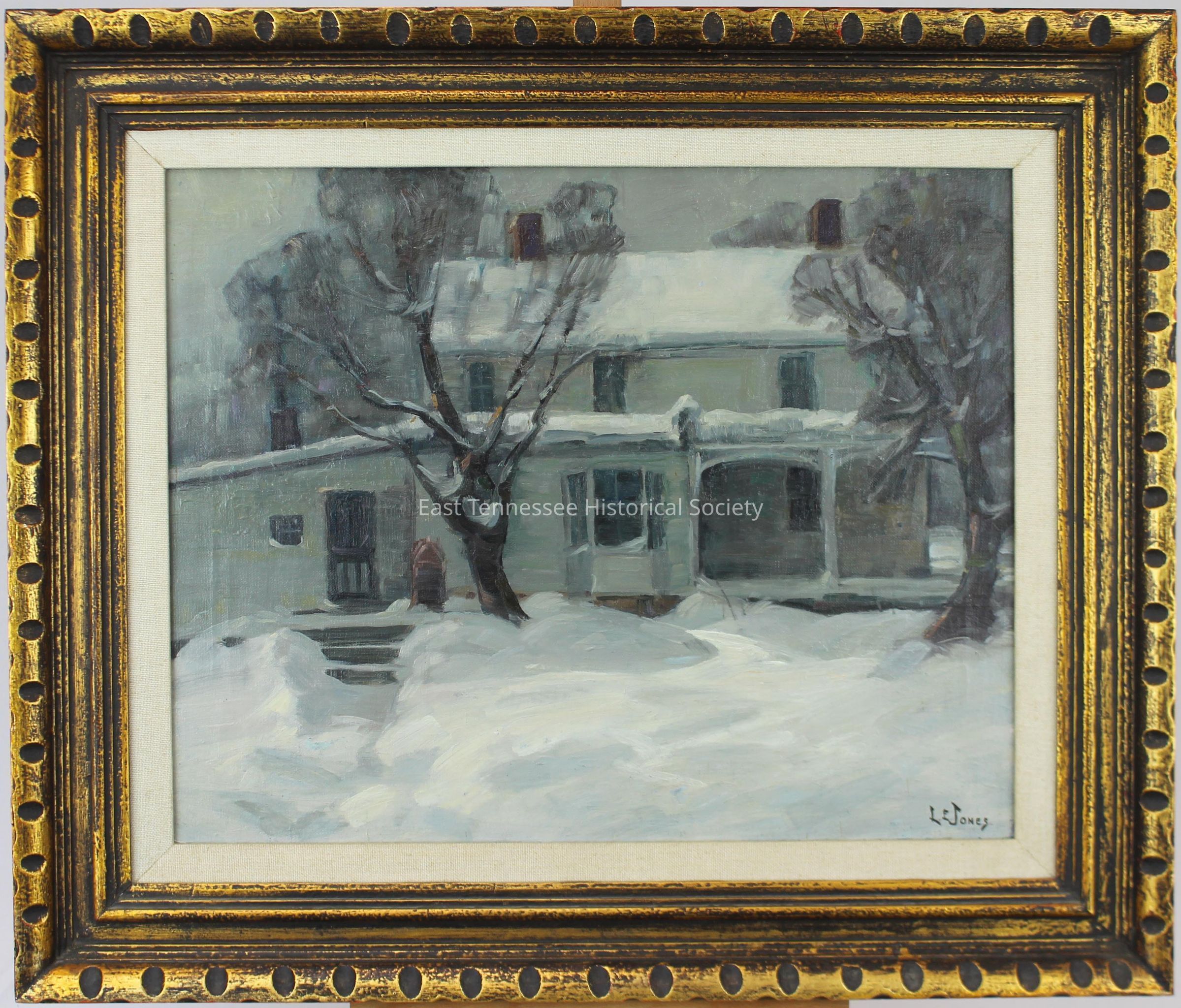 a) Painting (Jim Gray #2) by Louis E. Jones, oil on canvas, shows two-story white farm house with shuttered windows in snowy setting, large front porch on right side (facing house)/half-hexagonal with one-story room its left/slanted attachment with door at far left/three chimneys, two bare trees in yard, gray sky, signed "LE JONES" at bottom right, 16 7/8"h x 21 1/8"w at sight line, 1900-1958.
