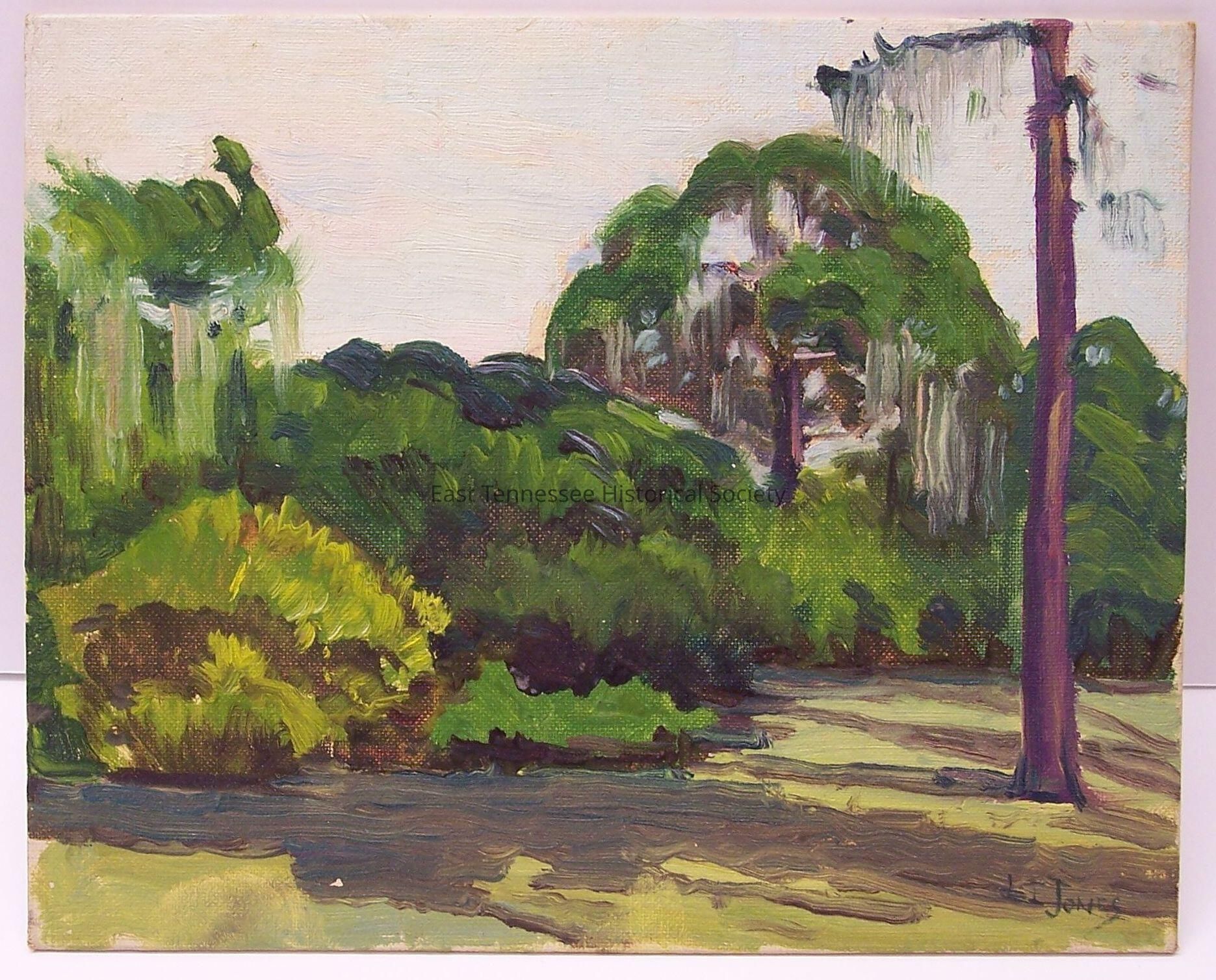 Painting (Jim Gray #48) by Louis E. Jones, oil on canvas board, shows landscape focused on semi-tropical looking bushes and trees, Spanish moss seeming hangs from branches, long shadows from vegetation stretch across golden dirt or sand, light-blue and peach-beige sky, signed "LE JONES" in green at bottom right corner, marked #48 at top left back corner, sticker marked "NEWTON / EXTRA QUALITY COTTON / CANVAS BOARD" upside down at back center, 8"h x 10"w, 1900-1958. [former L2013.3.34]Collection