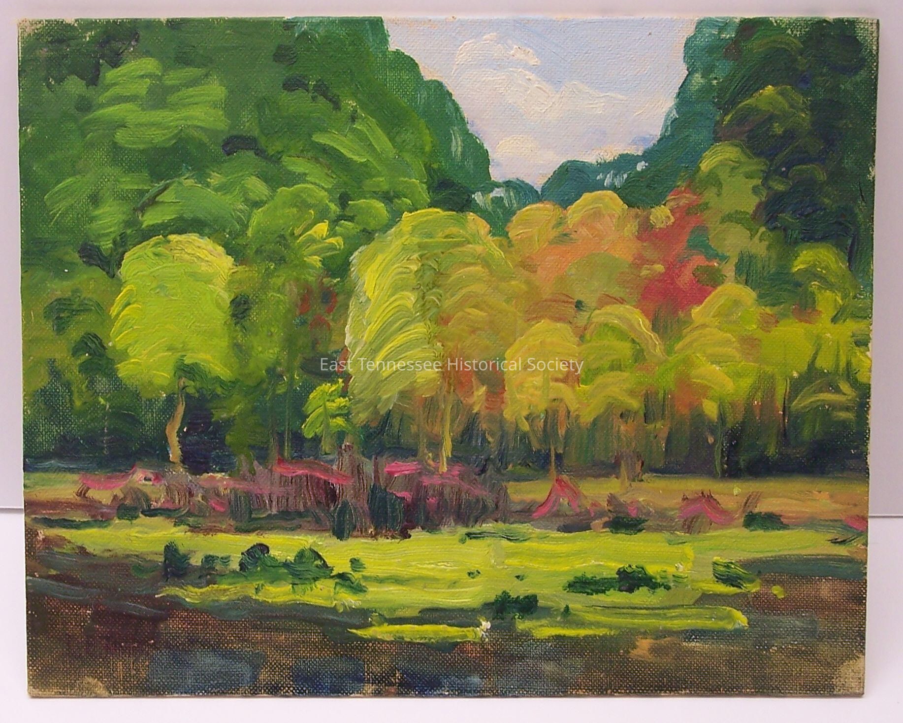 Painting (Jim Gray #49) by Louis E. Jones, oil on canvas board, shows landscape with water in front of grassy area with tall trees in yellow/green/orange/red, short randomly shaped strokes of hot pink beneath (perhaps depicting flowers), another taller treeline behind with dip at center revealing blue sky and clouds, signed LE JONES at bottom left corner, marked #49 at top left back corner, sticker at back center marked "NEWTON / EXTRA QUALITY COTTON / CANVAS BOARD," 8"h x 10"w, 1900-1958. [former L2013.3.35]Collection