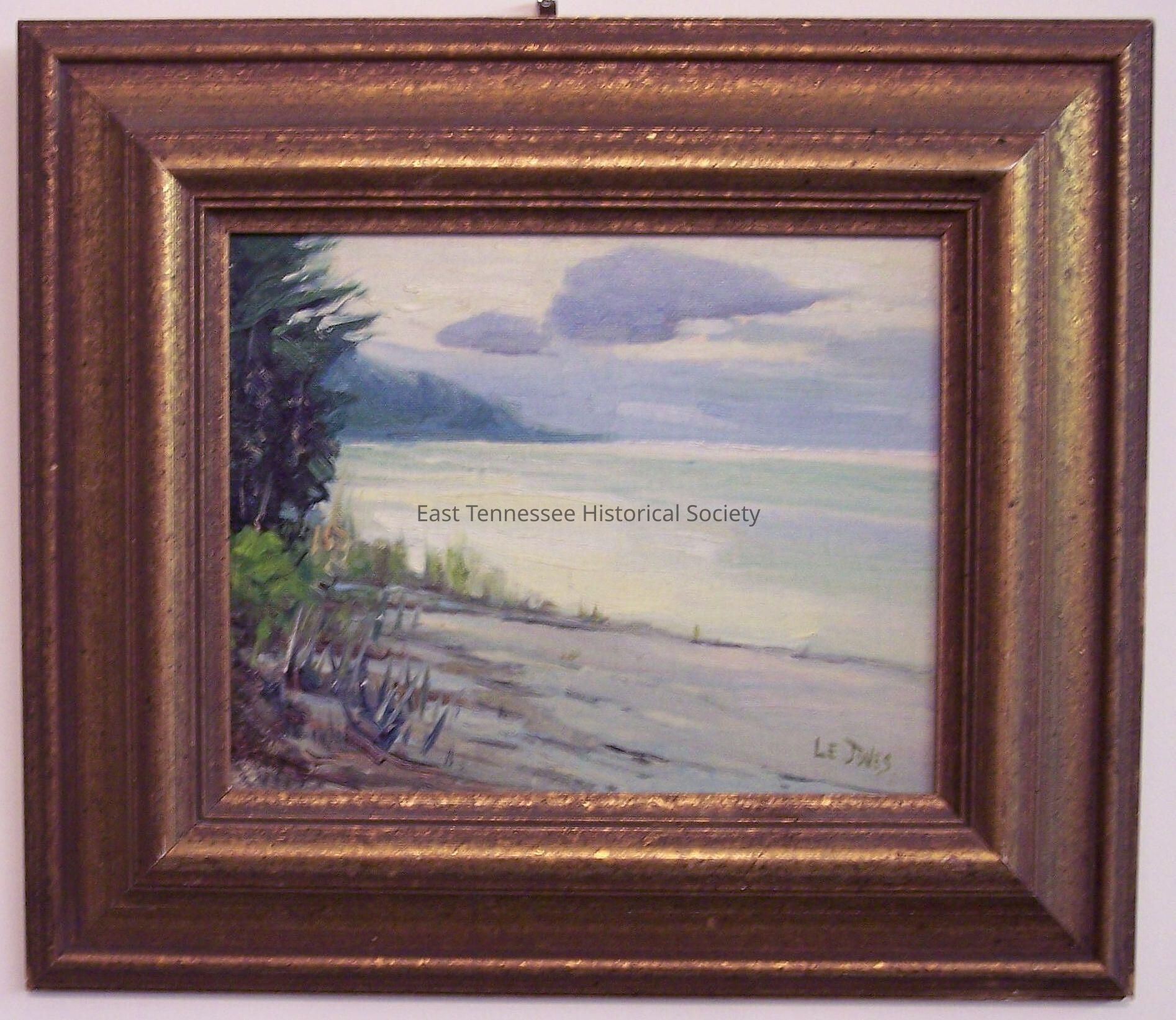 a) Painting (Jim Gray #24) by Louis E. Jones, oil on canvas board, left third shows shoreline with trees and sea grass, right two-thirds shows silvery blue sand with highlights of beige and soft pink/pale sea-green water/blue sky receding to pastel yellow with two large blue-gray clouds at top center, texture of paint thickens in places such as clouds and wave crests, signed "LE JONES" in lime-colored paint at bottom right corner, 7 1/8"h x 9 1/8"w sight/image area, 1900-1958.
