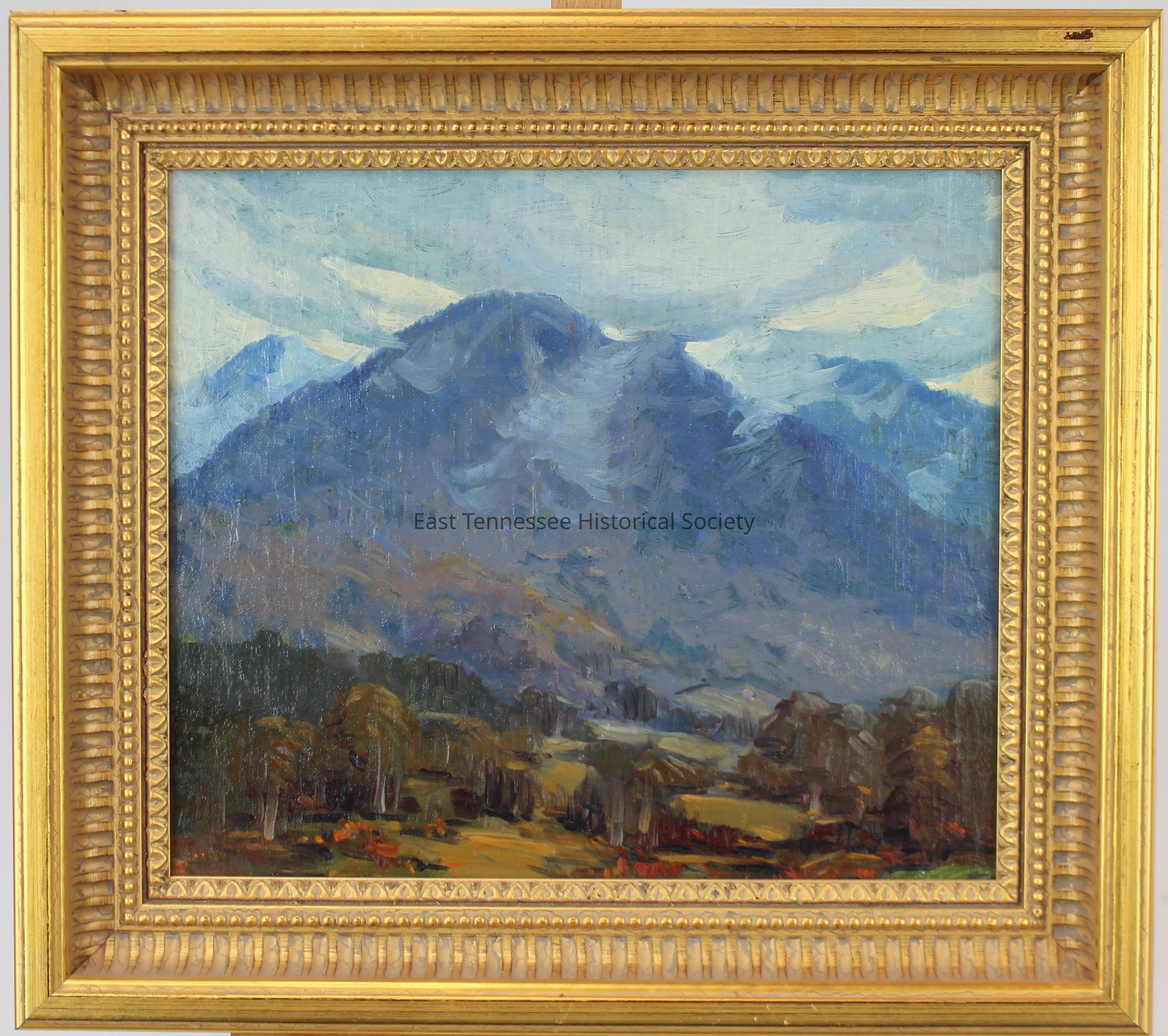 a) Painting (Jim Gray #28) by Louis E. Jones, oil on canvas board, Smokies scene, shows large blue mountain with another peak on either side, forest in fall colors below with a few open meadows between tree lines, golden grass, dark grayish-blue sky with large sweeping clouds several shades lighter, signed "LE JONES" at bottom left corner, 11 1/4"h x 13 1/4" sightline, 1930-1958.