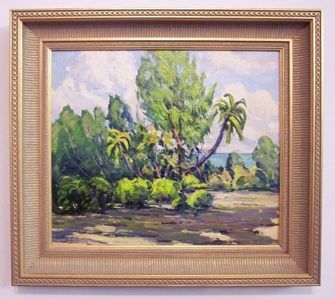 15717.75a) Painting (Jim Gray #12) by Louis E. Jones, oil on canvas board, shows tropical trees with limited view of ocean showing through at center right, sand with low vegetation in foreground, bright blue sky with white fluffy clouds, signed "LE JONES" at bottom left corner, painted salmon pink on reverse, marked 12 at top left corner, marked "No. LM-3083" on left-side plank, 11 3/4"h x 13 1/2"w, 1900-1958.