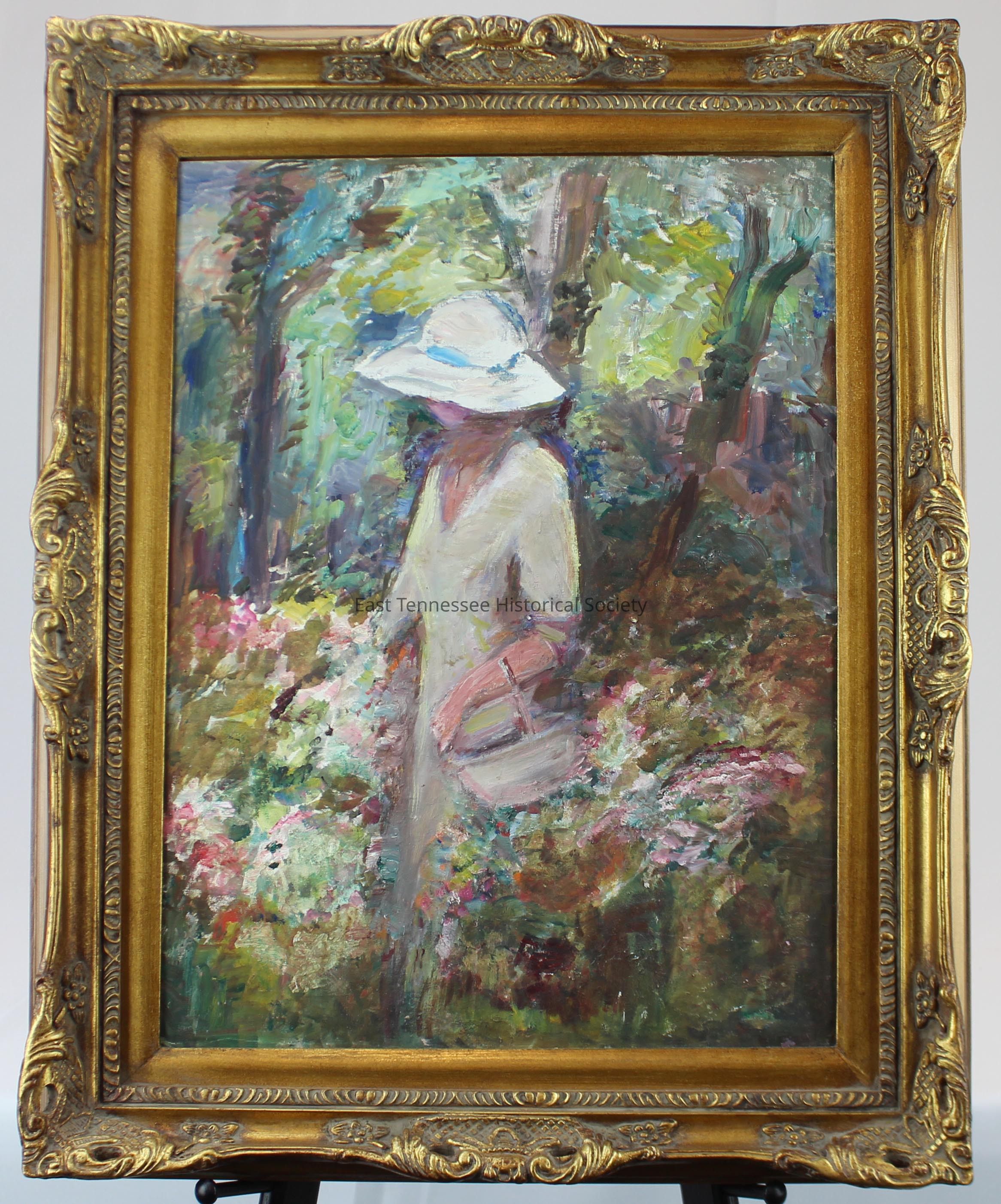 a) Painting by Eleanor McAdoo Wiley of woman in white dress, white hat with blue ribbon and basket over left arm, stands in a flower garden with trees in background, oil on board, loose brush strokes and splashes of color, not believed to be signed, 26"h x 20"w, 1977 or before.