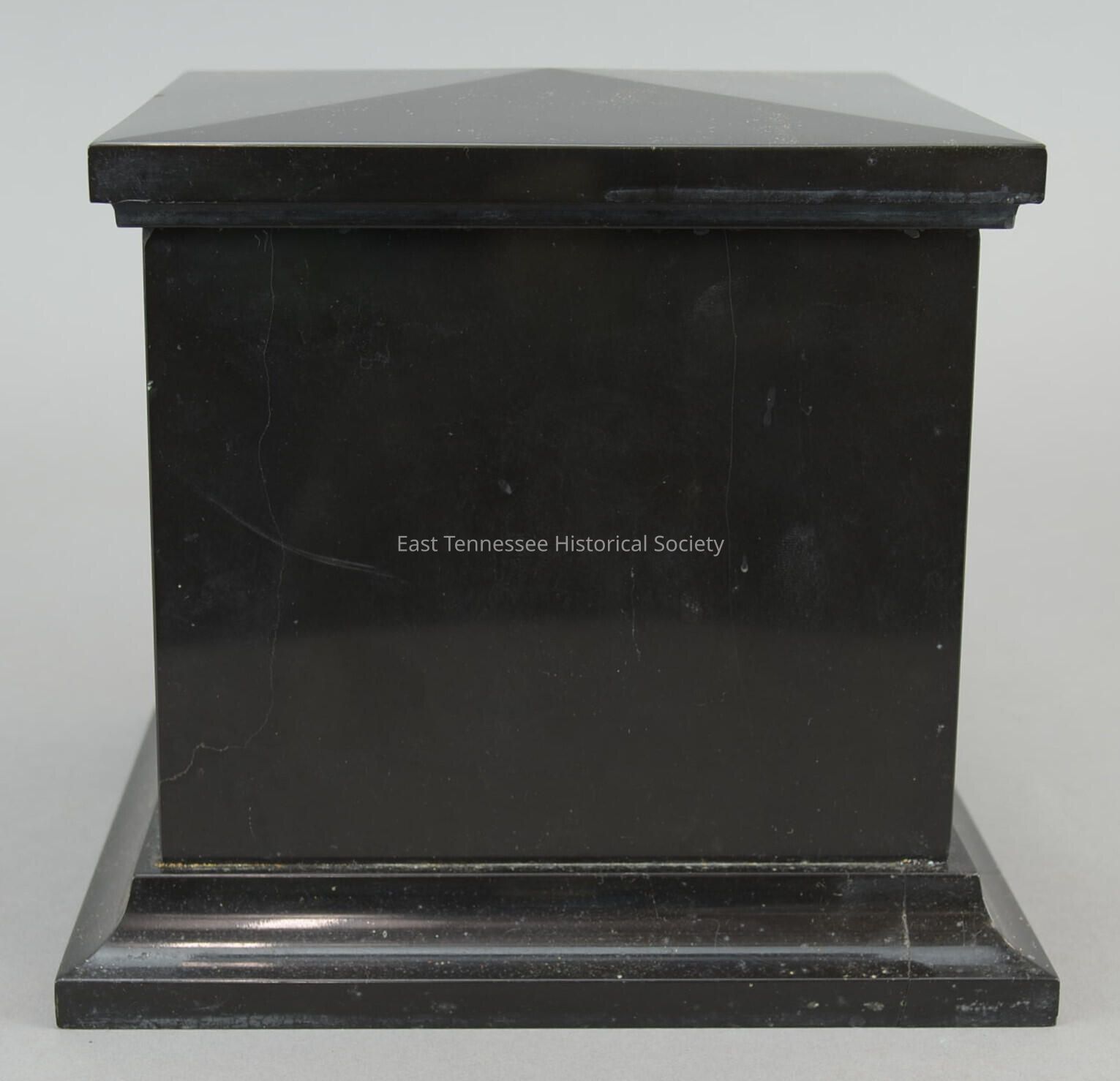 Cremation urn crafted at Gray Knox Marble Co., Indian Super Black marble (pure black basalt, often simply called a granite), exterior polished/interior unpolished, 7 1/2"h x 8 1/4" square at base, 1929-1956.