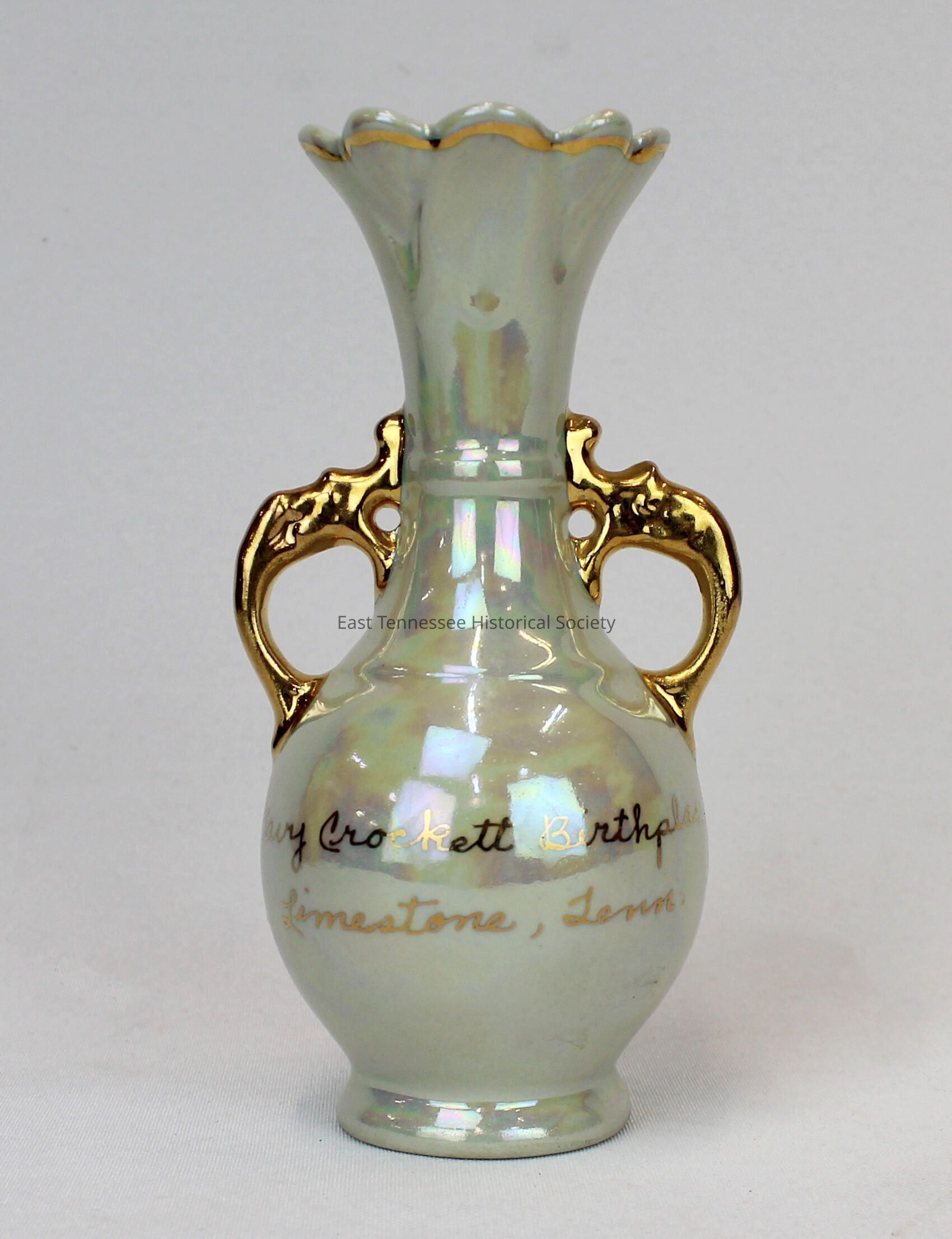 Vase commemorating Limestone birthplace of Davy Crockett, ceramic with opalescent glaze and gold paint, marked "Davy Crockett Birthplace / Limestone, Tenn." in gold script on front, gold-colored detailing around rim and handles on either side of lower neck, base stamped "HOSS / U.S.A."/antiques dealer attriubuted manufacture to Blue Ridge Pottery, 6 3/8" h x 2 7/8" diam., date unknown/20th century.Made/Created