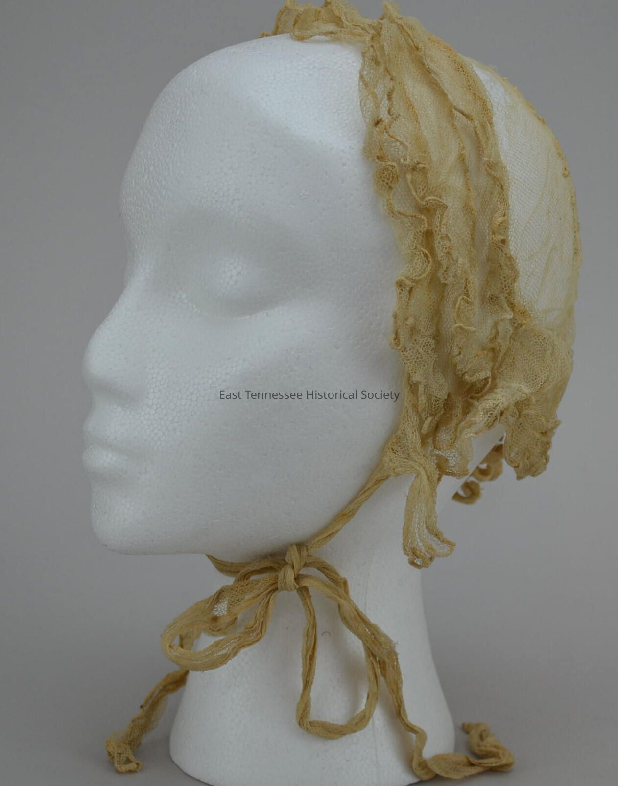 a) Cap of Rosalie Marguerittes Tauxe, beige mesh with ruffles and embroidery, three 1 1/2"w ruffles around front with handsewn corded edge, 3"w scalloped ruffle along reverse with handsewn corded edge, casing formed along back edge for 1"w mesh with handsewn corded edge gathering ties, 2 1/2"w mesh ties for tying under neck with cord sewn at corners of back and front ruffles, crown enbroidered with circular satin stitch-over-cord floral spray with vine, leaf and berries/small flowers and center flower, handmade (probably by Rosalie), 9" x 27" x 18", 19th century.