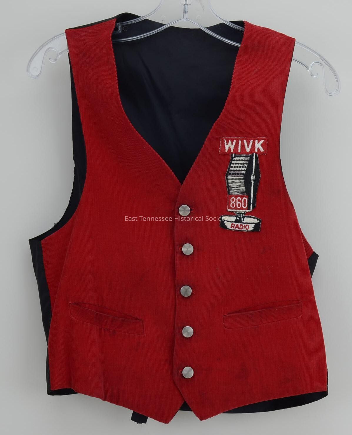 Performance vest of William H. "Stoney" Stonecipher, red corduroy front, five silver-colored metal buttons at closure, two slash/inset pockets on lower front, patch at proper left breast marked WIVK / 860 / RADIO with microphone, black taffeta back/half belt (with black metal buckle)/lining, manufacturer unknown, 22"h x 18" at chest, early 1970s.Made/Created