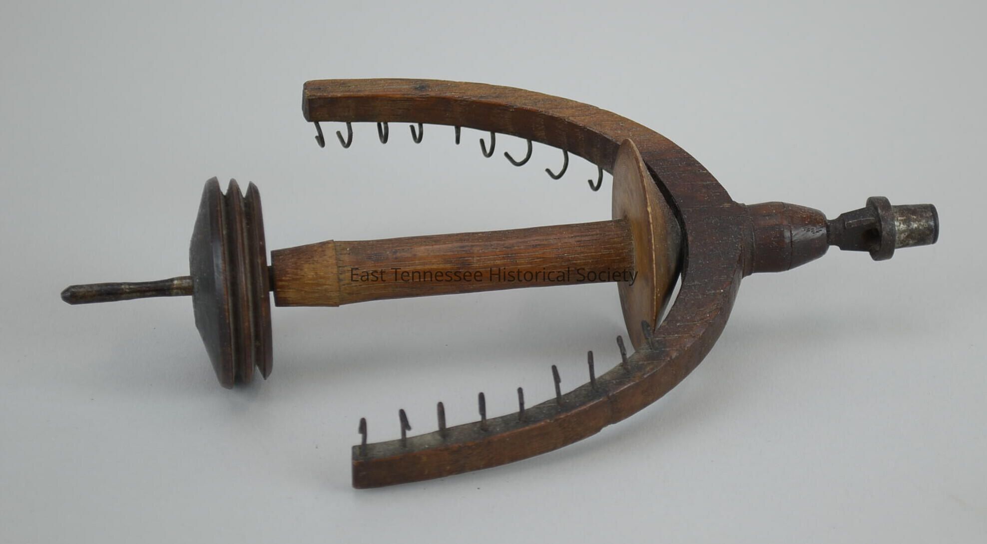 Flyer for treadle/flax wheel [not in ETHS collection]^, wood and metal, 4"l U with turned finial mid-way, open wire hooks inserted into wood with open end facing out, hooks on opposite sides at each arm, metal shaft inserted through finial and wood disc into wood rod, three wood discs held on rod with metal pin, unknown maker, 4 3/4"h x 8 1/4"w x 2"d, c. 1864?Made/Created