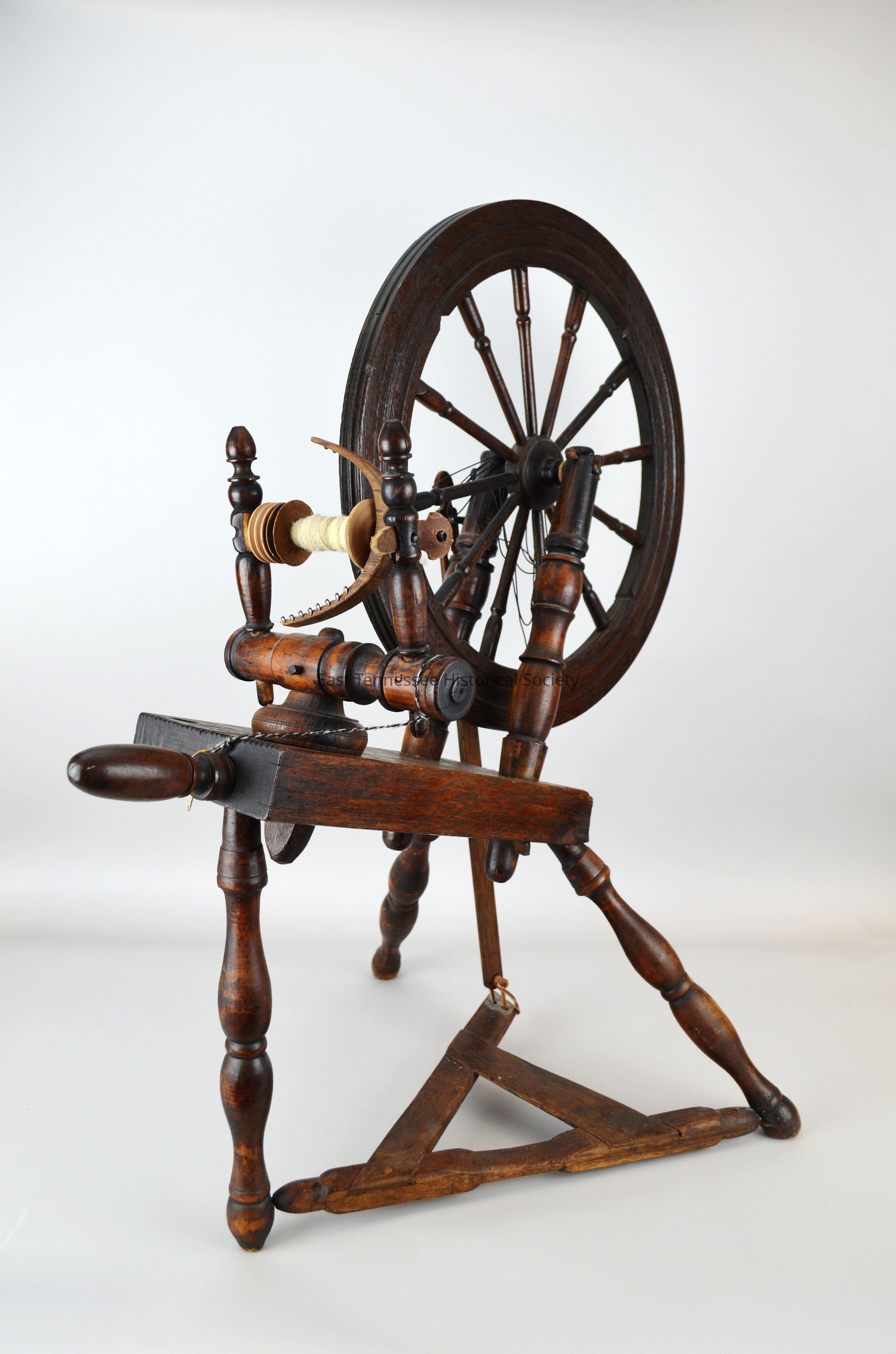 Dark colored wooden spinning wheel, base measures 28" x 33" x 18". Wheel is on top of base and measured 20" across. On front, mother of all measures 9" w x 9 1/2" h. Donor indicated that the wheel may be for a left handed user because the treadle is on the left side.Dimensions