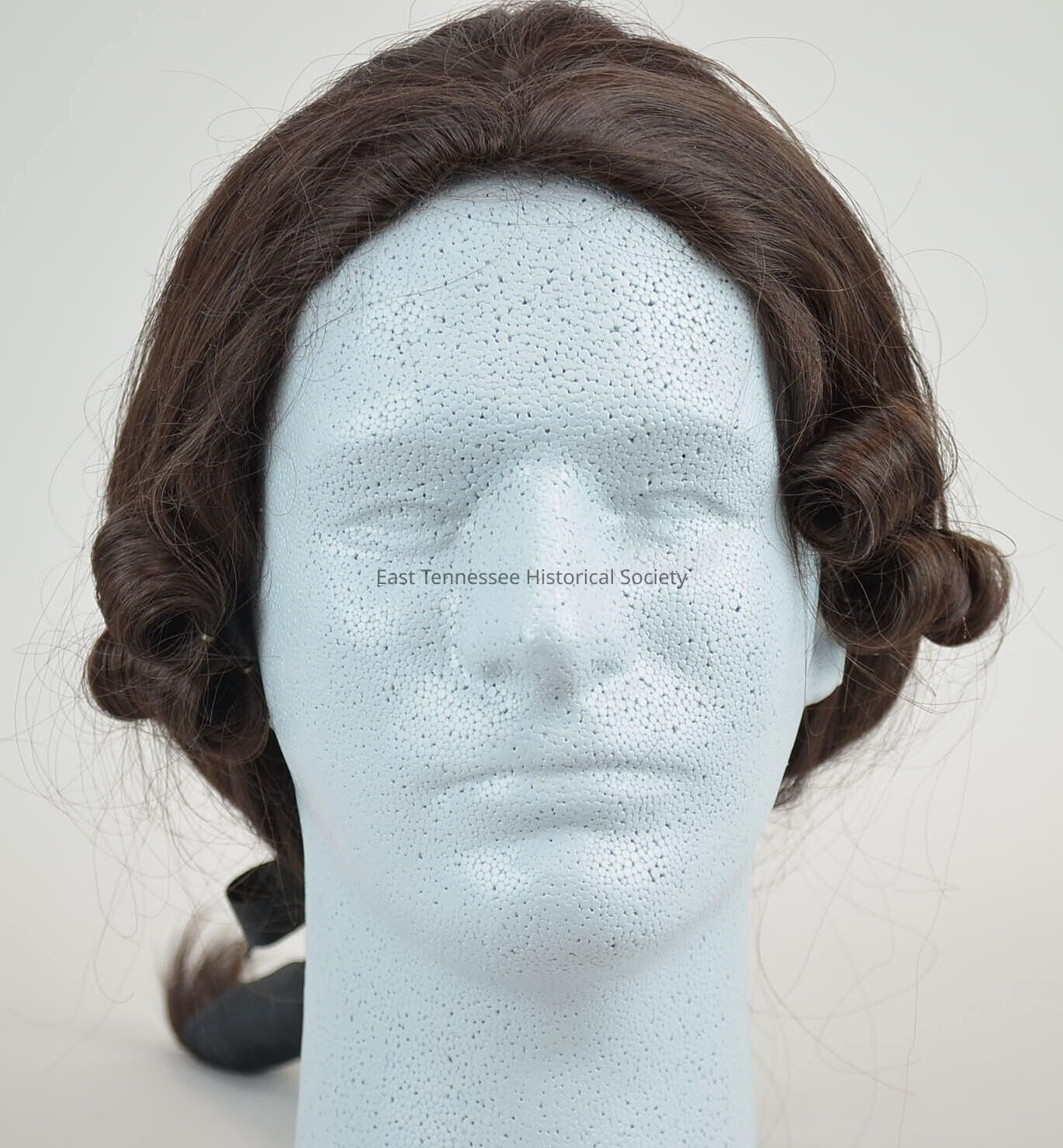 Gentleman's 18th century-style wig with side curls (two on each side) used by reenactor Sam Reed, brown synthetic (modacrylic) fiber, 9" hair at back, wrapped with black grosgrain ribbon and made into a bow at top, mesh base with elastic, elastic strips on each side, hook and loop closure at back, manufactured, 2.15"h x 8"w x 2.8"d, 2007-2016. Only worn once.Made/Created