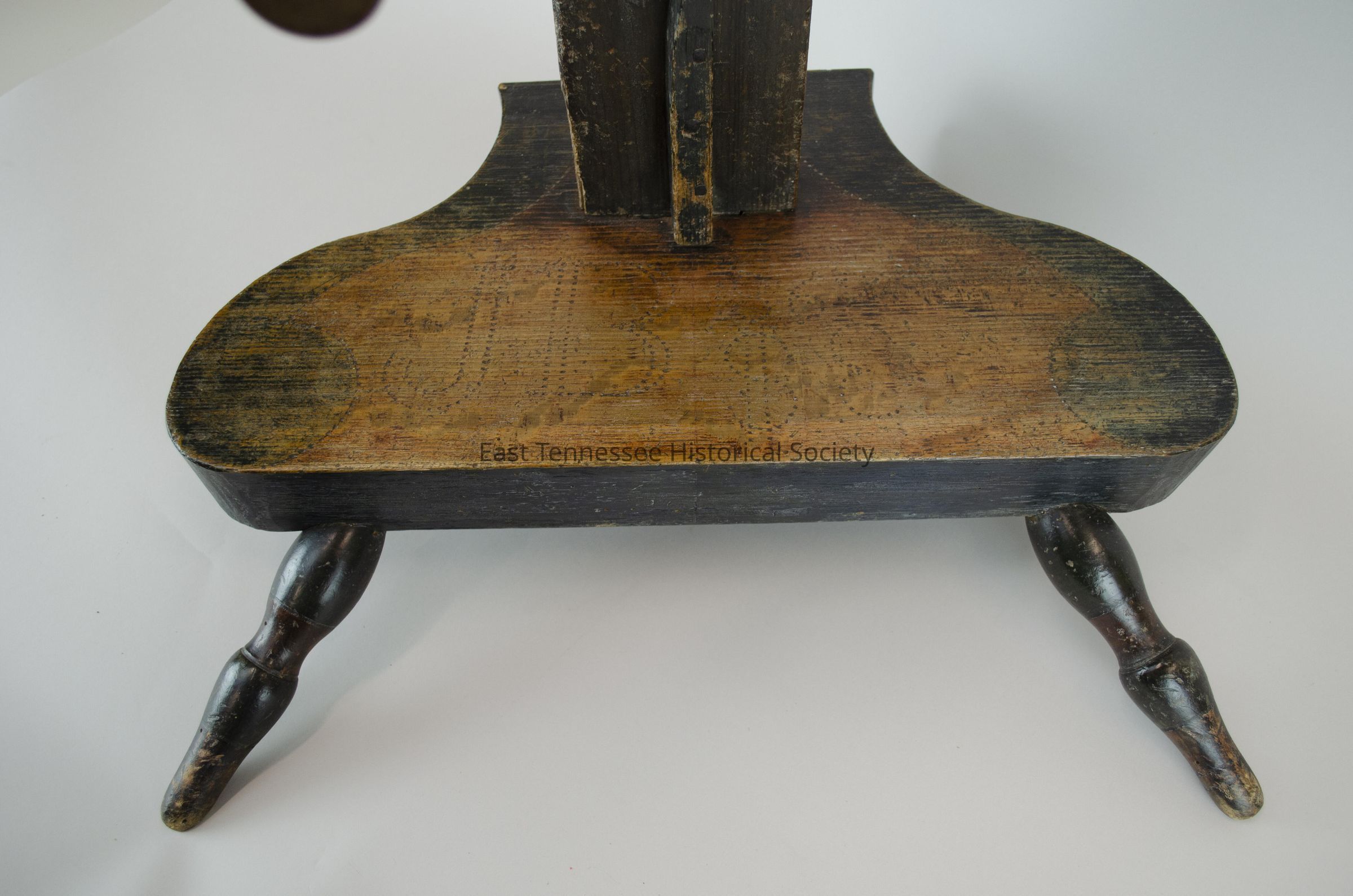Counter/winder/weasel believed to originate with Elizabeth Jane Lotspeich Browder, stained and painted wood, turned legs and arms painted dark red/dark green with painted stripes in black, dark-red square with yellow circle divided in quarters on front of box with metal pin at center with 7 92 at top/100 8 at right/100 44 at bottom/9 3 at left, hand-cut nails, three-legs, six-arms on box with turned finial on top, "JB" [maker/wheelwright John Bedwell] picked on base, handmade, 43"h x 26"w x 16 1/2"d, marked "1864."Made/Created