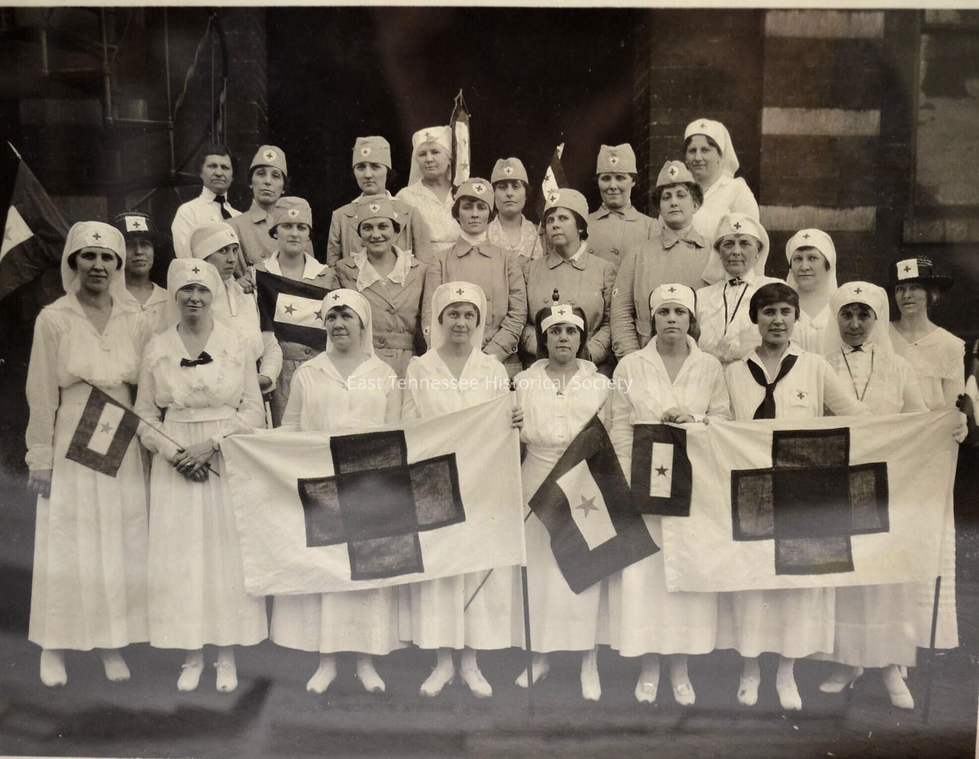 Photograph (b&w) of Women's Red Cross workers including Mrs. Lucinda Dickinson Hudson (mother), three rows of women some wearing white uniforms and some that appear in gray tone, two in front row hold Red Cross flags, several hold small single-star flags indicating a family member serving in the military, Knaffl & Brakebill, WWI/c. 1917.Reddish-brown wood frame, glazed. wire hanger, 8 1/2"h x 10 1/2"w x 1/2"d.Collection