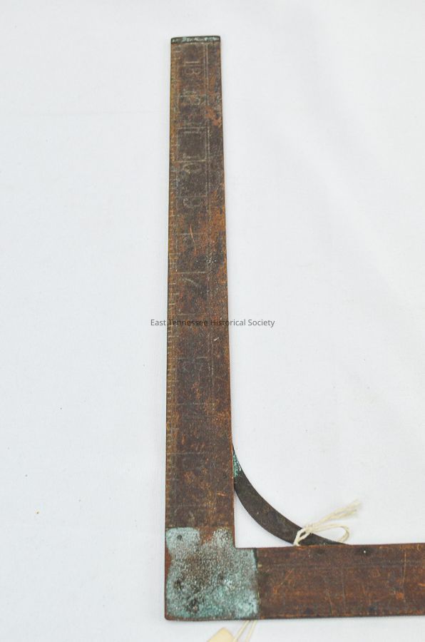 L-shaped tailor's yardstick with ownership attributed (by tradition) to Peter Staub, ight to left: one inch (includes Y4, Y2, Y9 marks) incised numbering on one side, right to left: fractional incised numbers of common yardage amounts on the opposite side, unknown maker, 36" x 7/8" x 3/16".