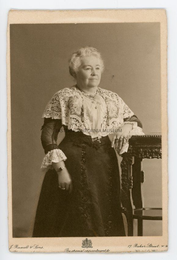 Mounted studio portrait of a woman, likely Edith O'Gorman, resting her elbow on a carved table. Photographer was J. Russell & Sons of England. Signs of editing around her waist to make her appear slimmer.