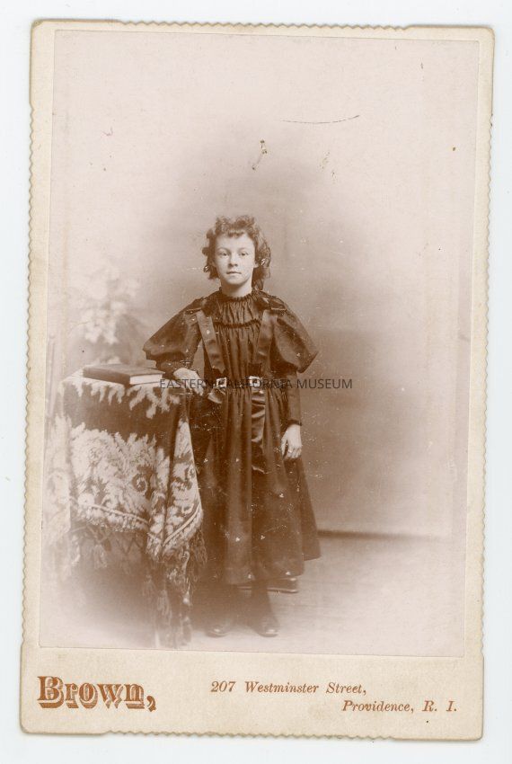 Mounted full length studio portrait of a young girl in a black dress with two vertical ribbons and buckles. Photographer was Brown of Providence, Rhode Island. The mount edges are scalloped.