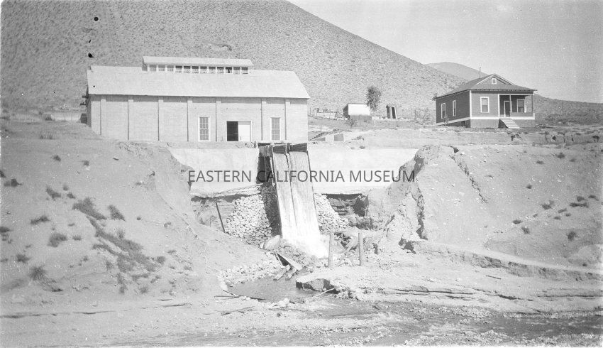B & W digital scan of Cottonwood Power Plant, Owens Valley, the second hydroelectric plant to go into operation supplying power for the construction of the Los Angeles Aqueduct, such as running steam shovels and other equipment. Water from plant flowing into ditch in the center of image.