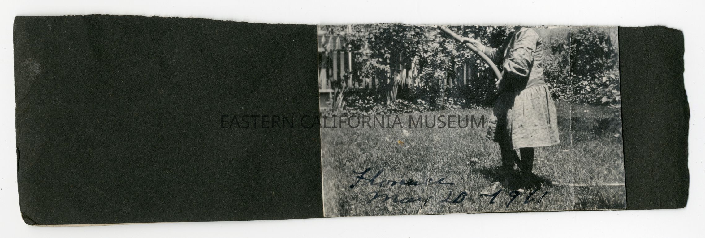 Page cut from a photo album containing an exterior photo of a young child holding a hose. It is labeled on the bottom in ink: Florence, May 20, 1911.Collection