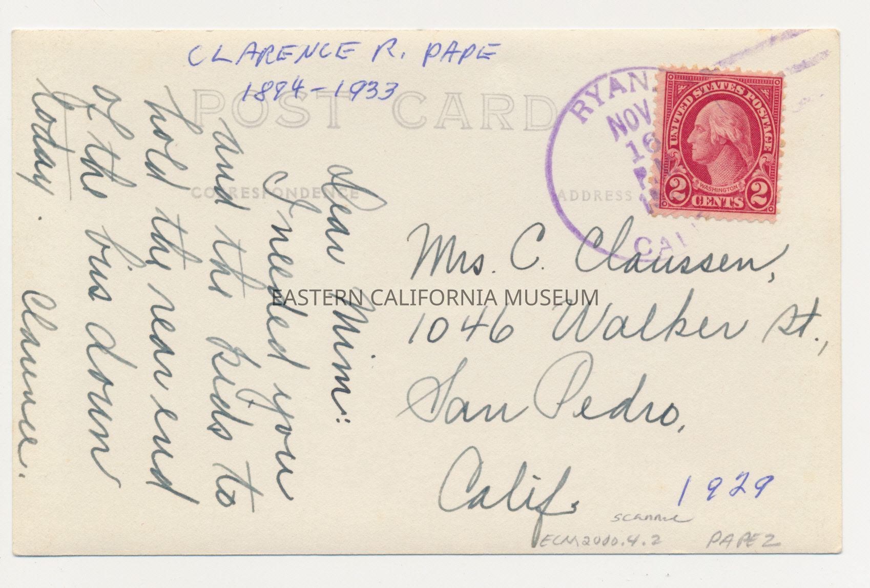 The postcard was sent to Mrs. C. Claussen of San Pedro, CA from Ryan on November 16, 192-. It has a red two cent George Washington stamp. The letter says, "Dear Mim, I needed you and the kids to hold the rear end of the bus down today. Clarence."