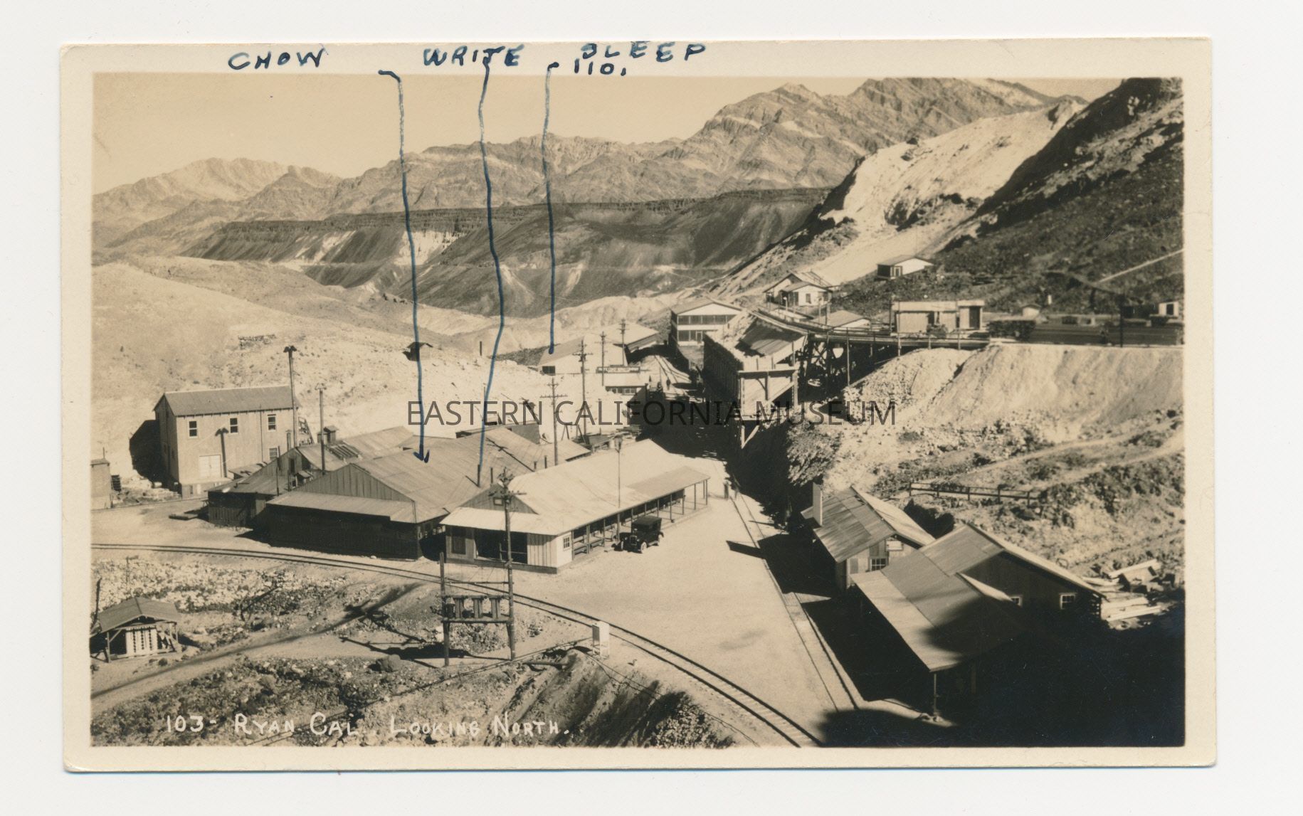 Photo postcard titled, "103 - Ryan, Cal. Looking North" showing the mine and camp community of Ryan in Death Valley. The sender has identified buildings where he eats ("chow"), writes, and sleeps. Under "sleep" is also written 110--maybe the number of beds or employees?