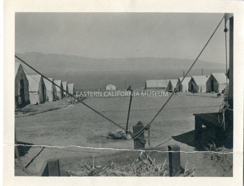 Laborers section of LA Aqueduct construction camp with white canvas tent cabins. This camp overlooks the Owens Lake when it was full of water.