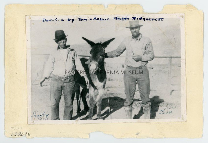 Photo of two men and a burro. The man on the left is identified as Shorty Harris and the man on the right is Seldom Seen Slim (Charles Ferge). Written at top of photo is: Donated by Tom and Bessie Towles, Ridgecrest.Collection